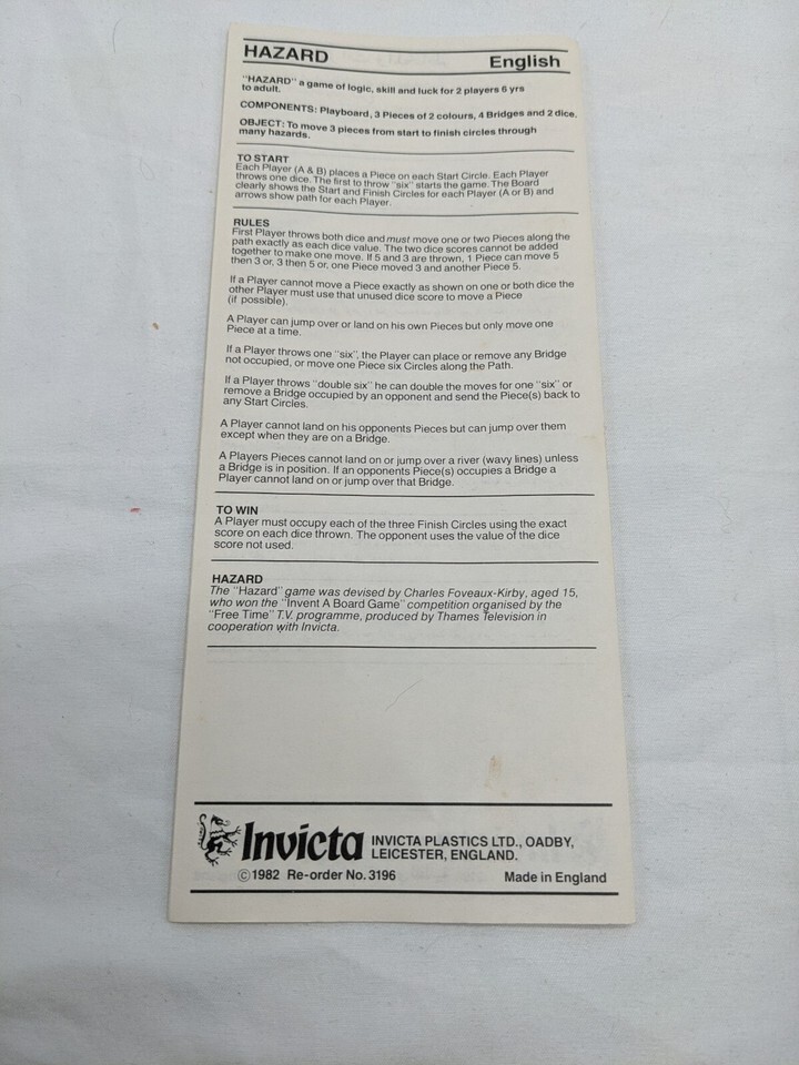 - *99% COMPLETE* Thames Freetime Hazard Board Game Invicta Games