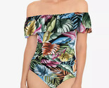 A tropical print adds an exotic accent to this Swim Solutions one-piece that's ruched and ruffled with off-the-shoulder style and a tummy-control design.