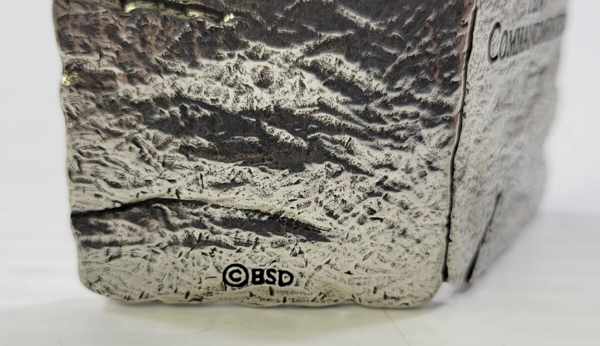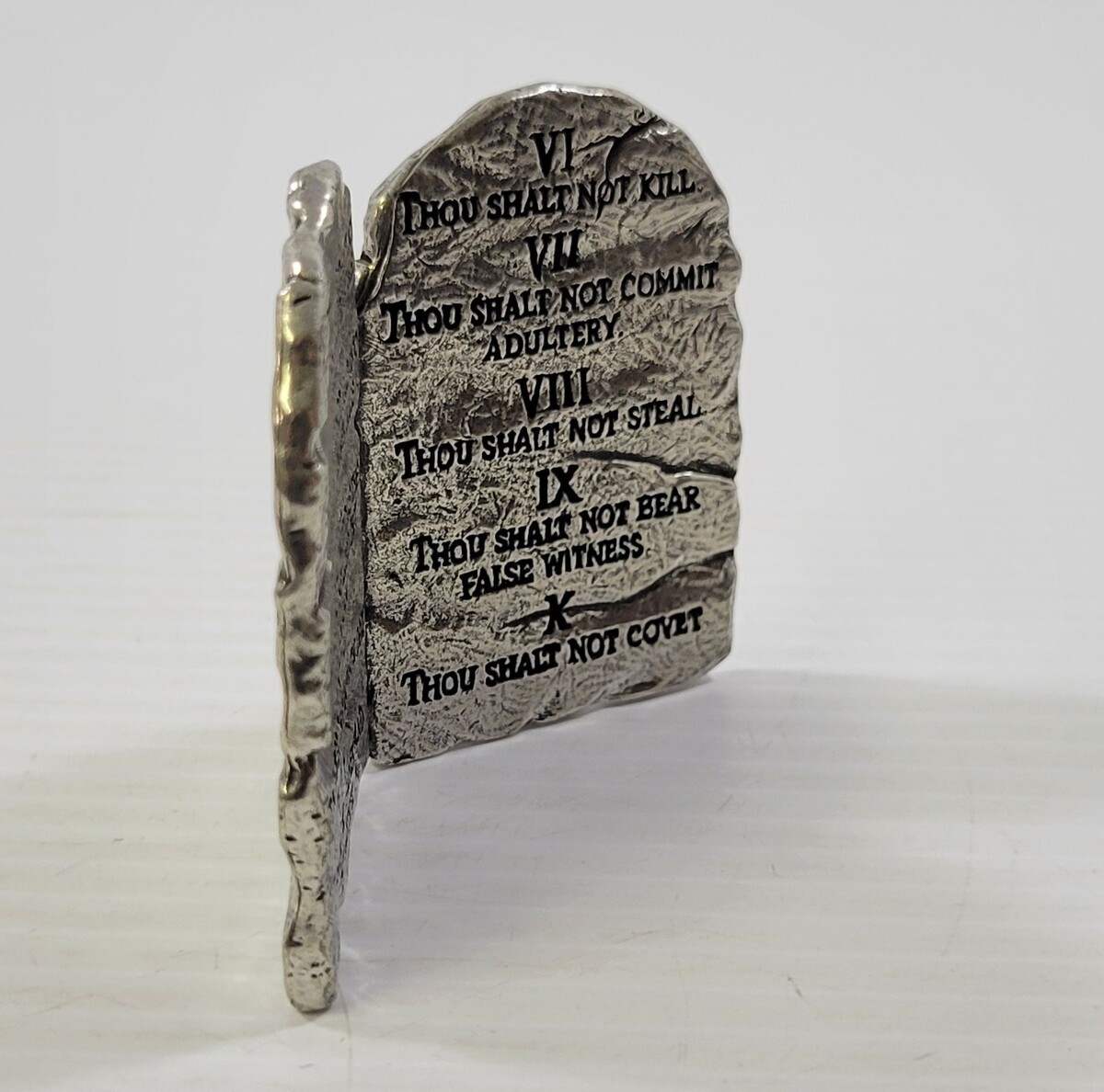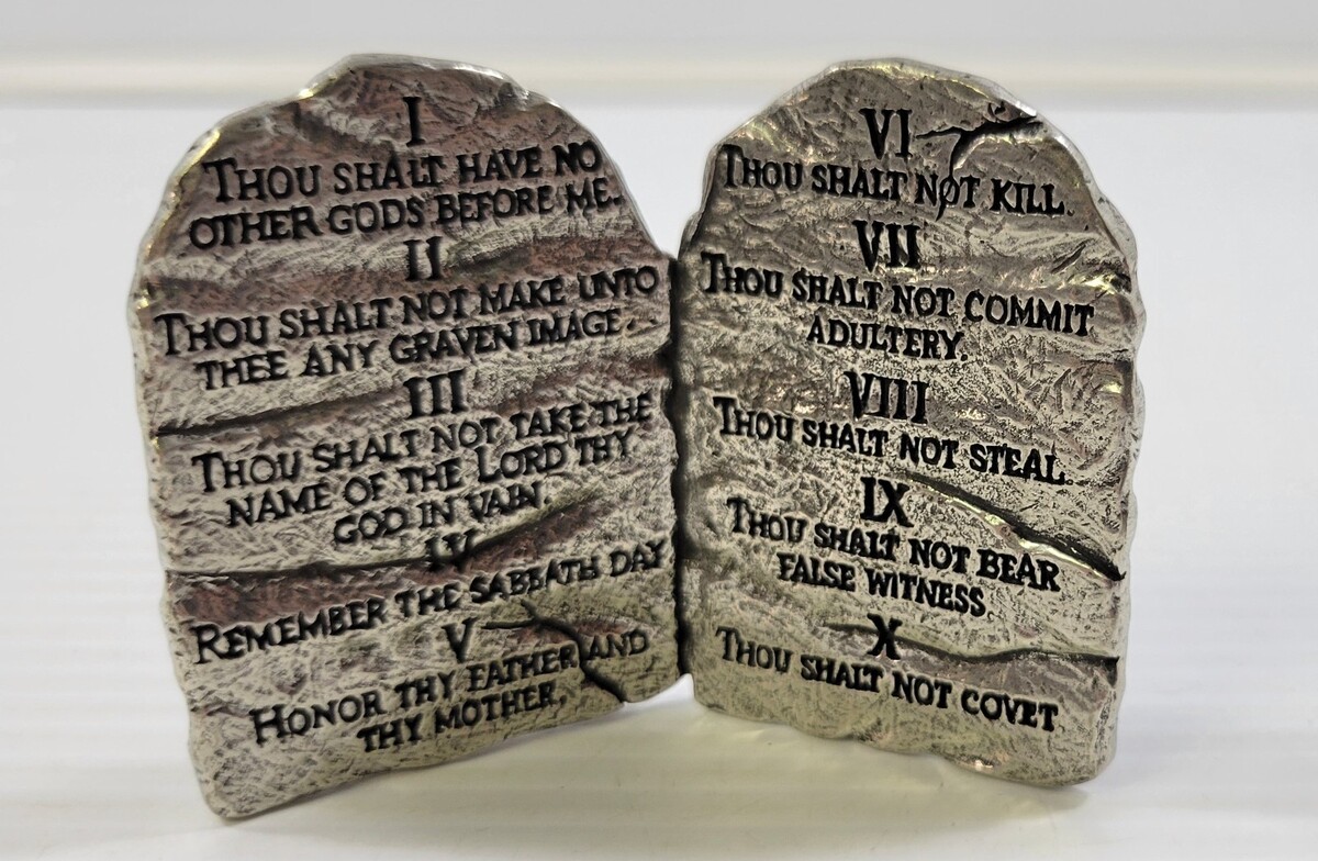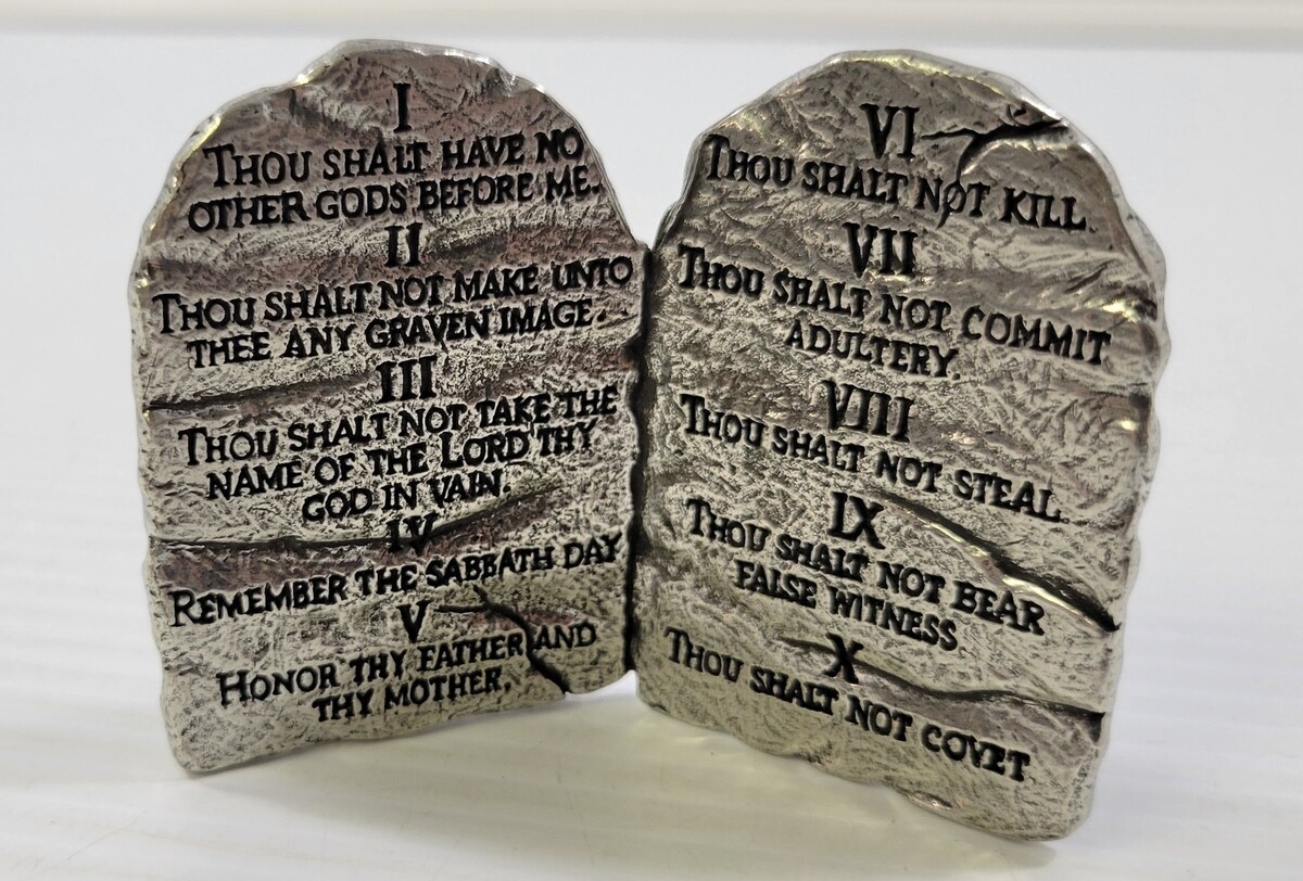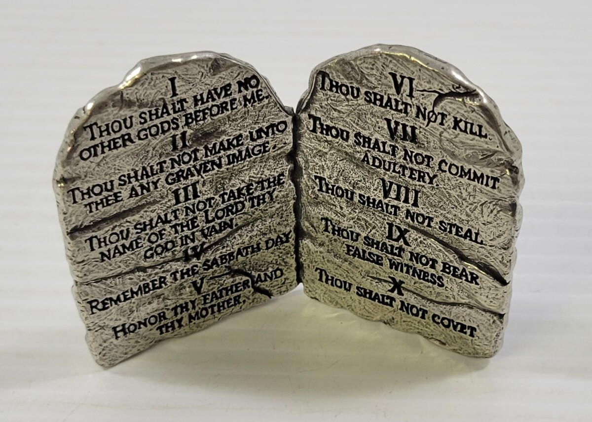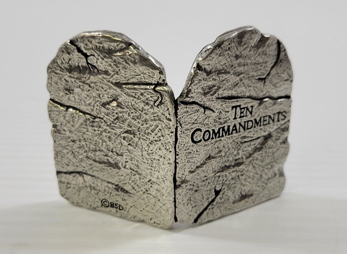 - *C52) Miniature BSD Religious Metal 10 Commandments Tabletop Sculpture