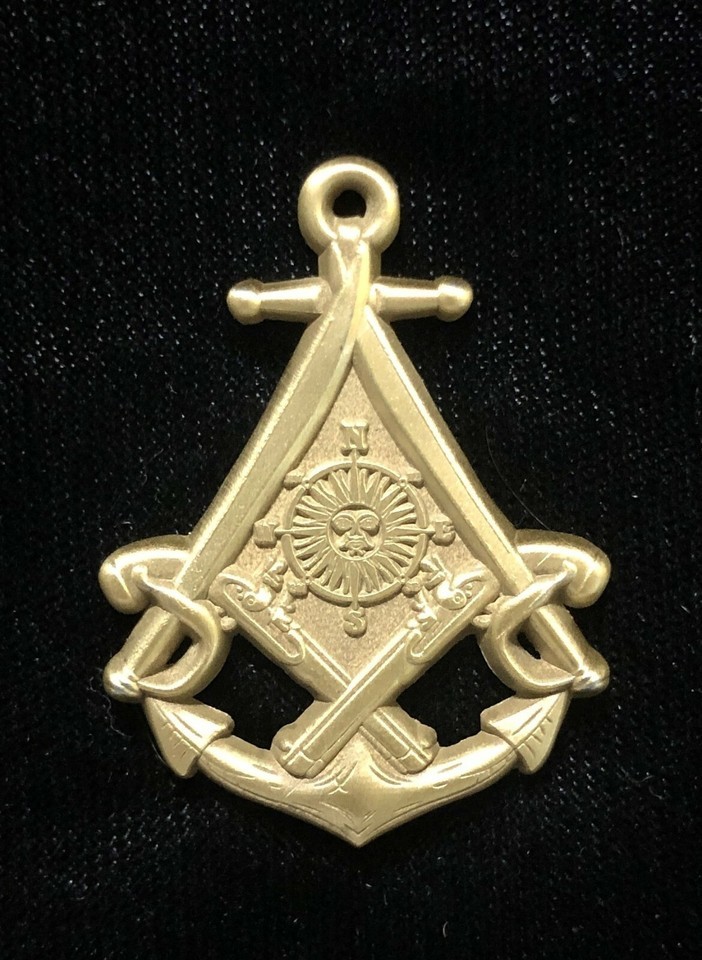 ?Cutlasses and Flintlocks with Sun and Anchor? Masonic Freemason Pirate Pin in Antique gold. Measures 1.5? tall. Double pinback.