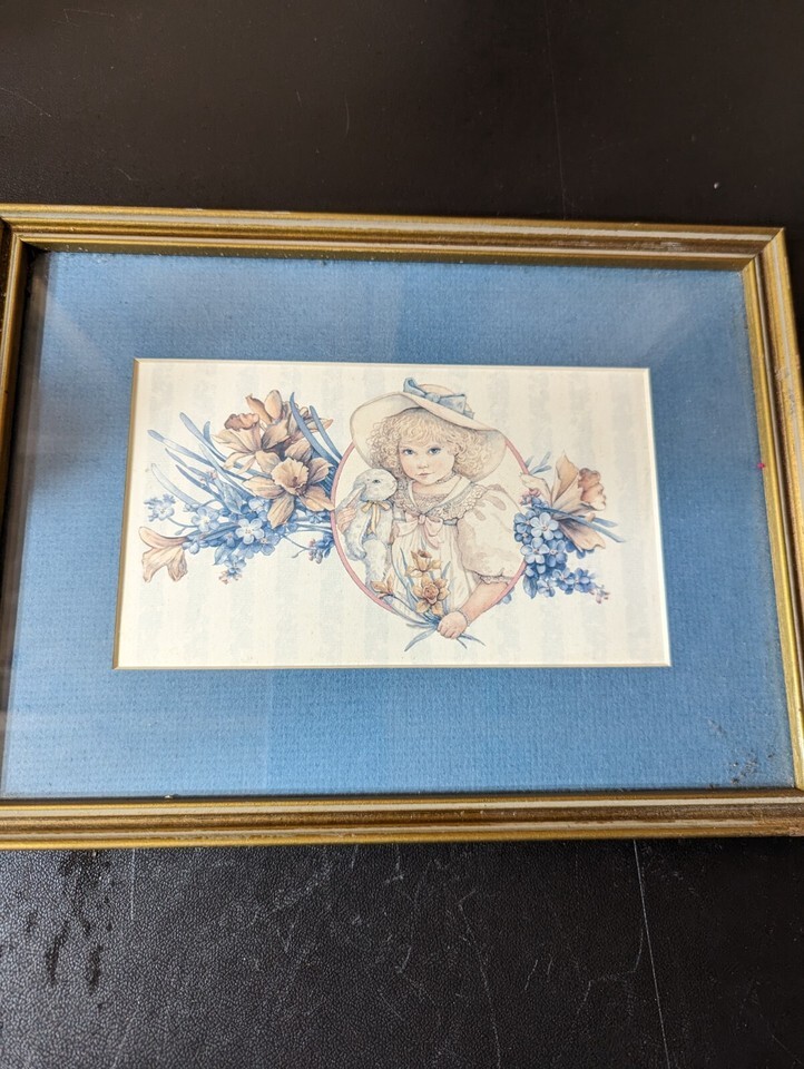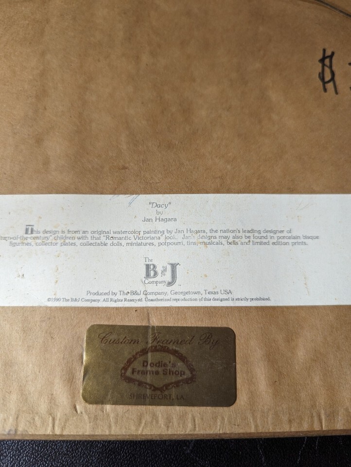 "Dacy" is a licensed print of an original painting by Jan Hagara. The print is 11 inches in length and 8.5 inches in height, with a portrait orientation. The lithograph print was produced in the United States in 1990 and is matted and framed. The subject of the print is children and infants, with a theme of innocence and childhood. The print is a small-sized reproduction of the original painting and is not signed.