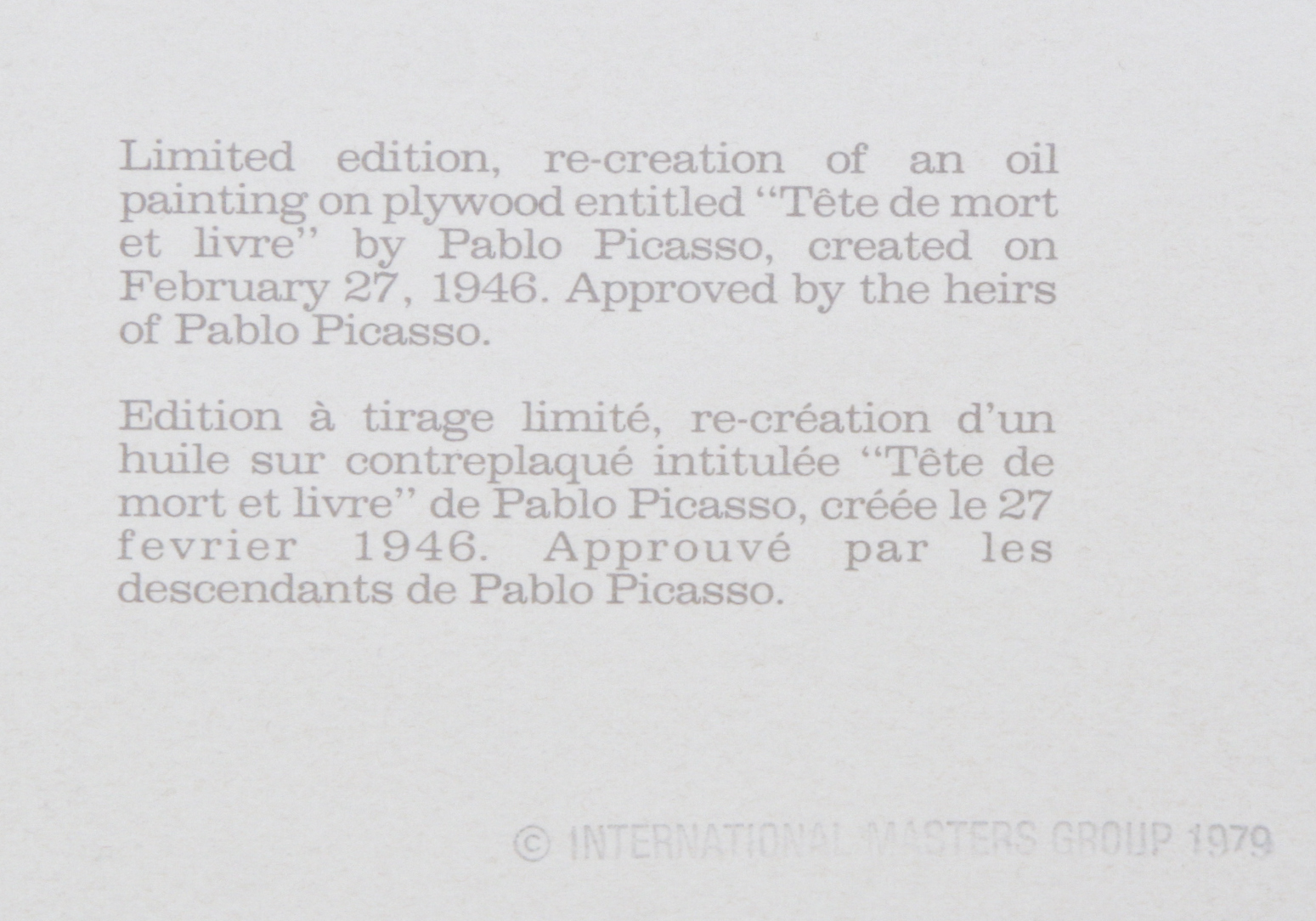 Apres la mort de Pablo Picasso en 1973, sa petite-fille Marina Picasso a autorise l'impression de ces lithographies, connues sous le nom de Picasso Estate Collection.