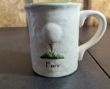 The 'Fore' Golf Coffee Mug is a unique and charming addition to any golfer's collection. Made of ceramic and porcelain, this small round mug features an embossed design of a golf ball in the shape of a novelty coffee mug. Perfect for enjoying hot or cold beverages on any occasion, this vintage piece is oven safe, microwave safe, and dishwasher safe. The beige color and sports-themed design make it a perfect gift for golf enthusiasts or a fun addition to your own home decor. Made by Russ, this original coffee mug is a must-have for any golf lover.