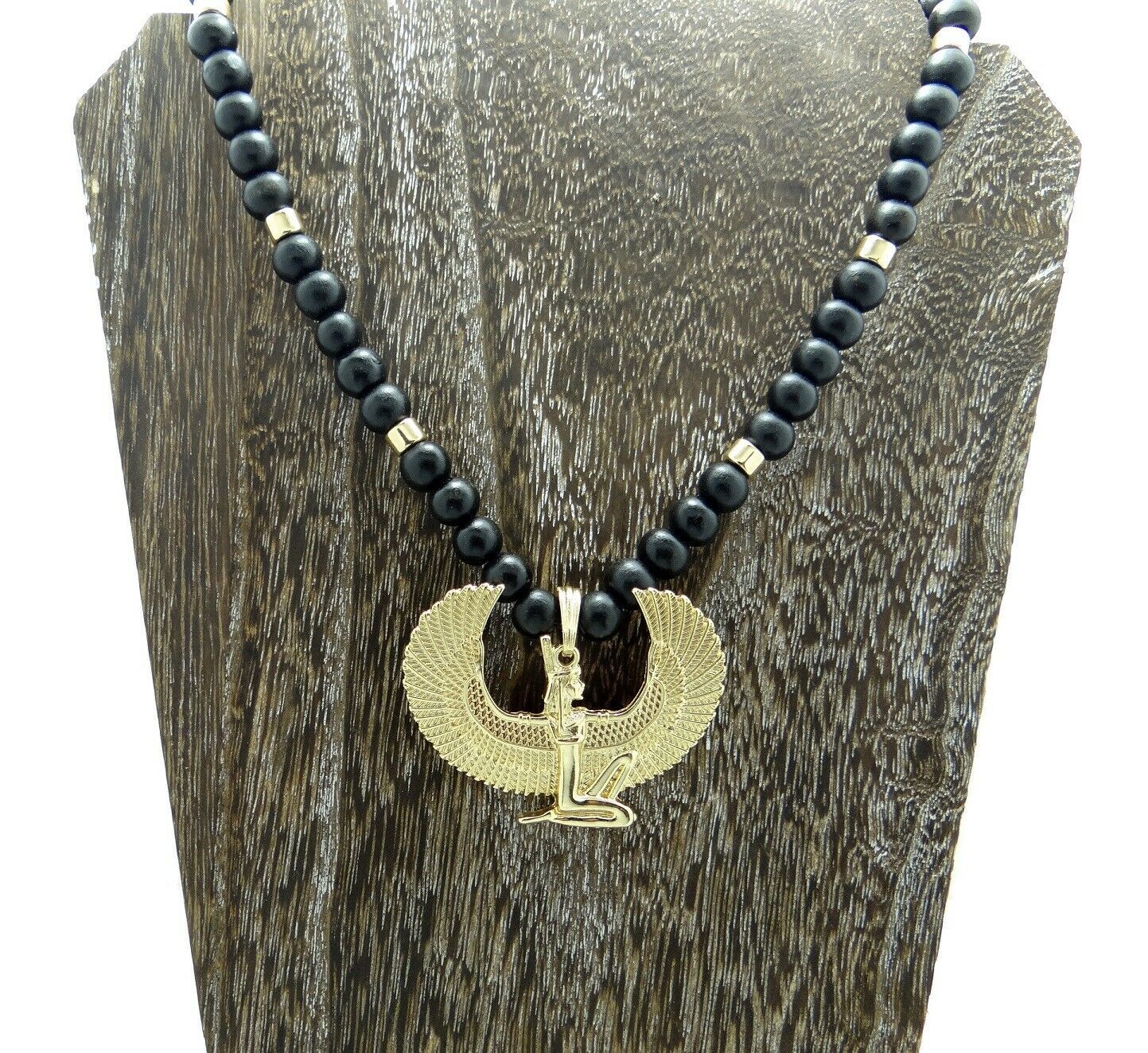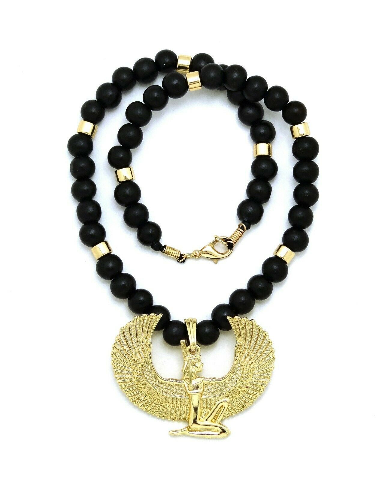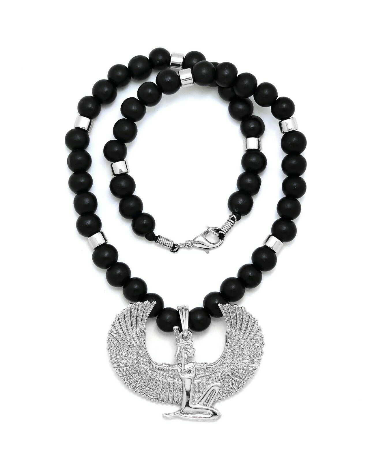 - Egyptian Goddess Isis with Wings Pendant Wooden Beaded Necklace