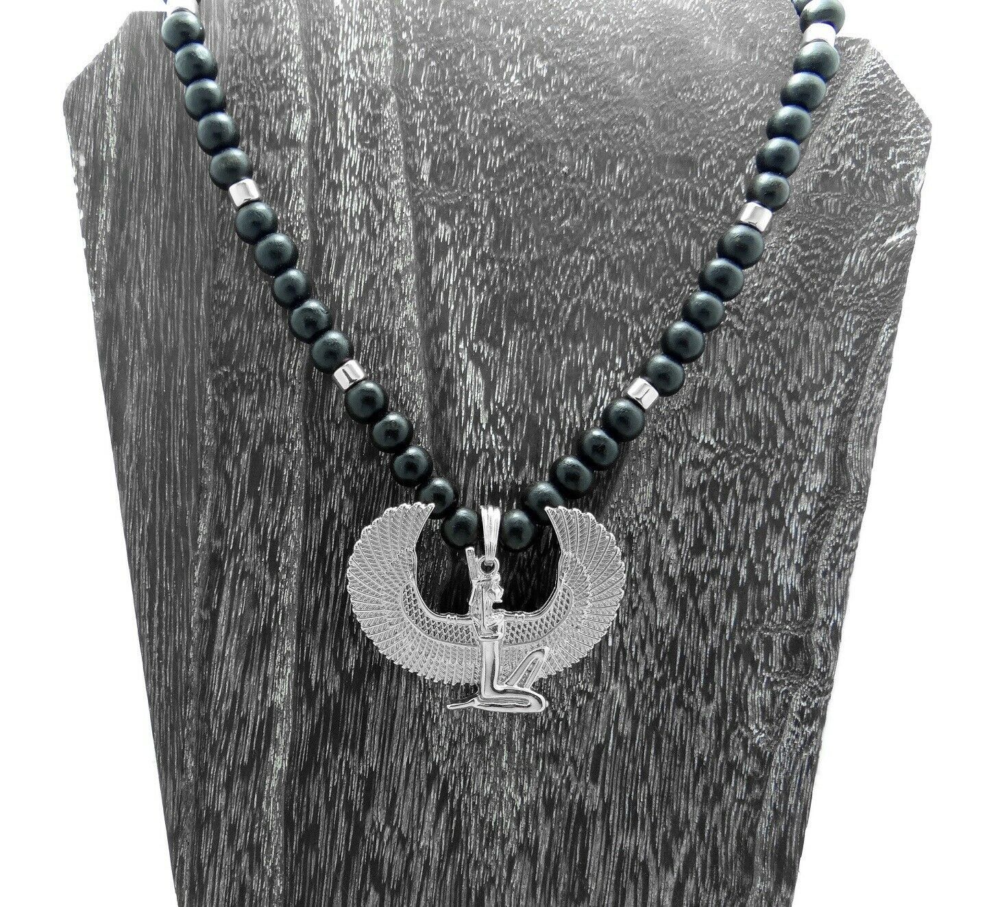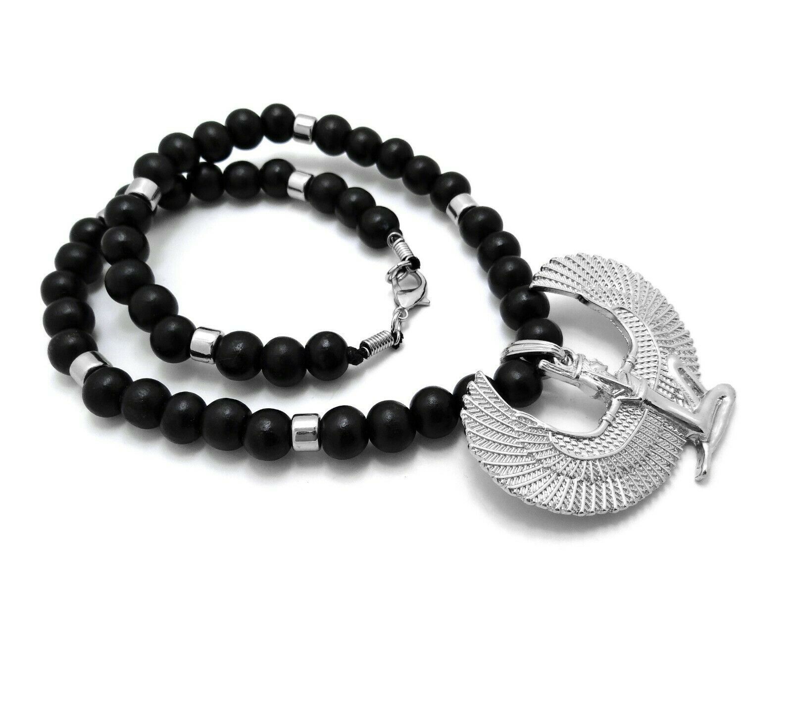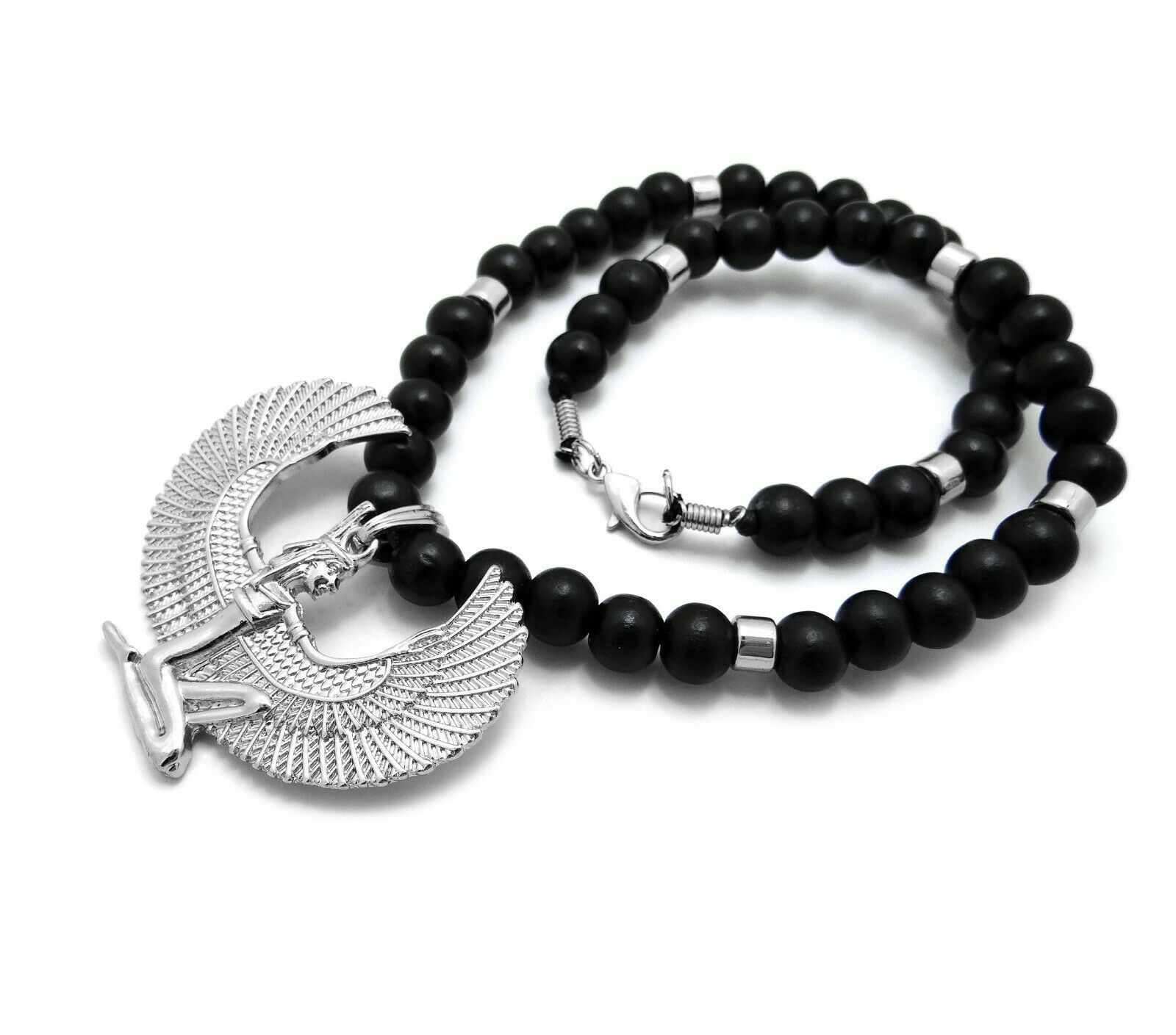 - Egyptian Goddess Isis with Wings Pendant Wooden Beaded Necklace