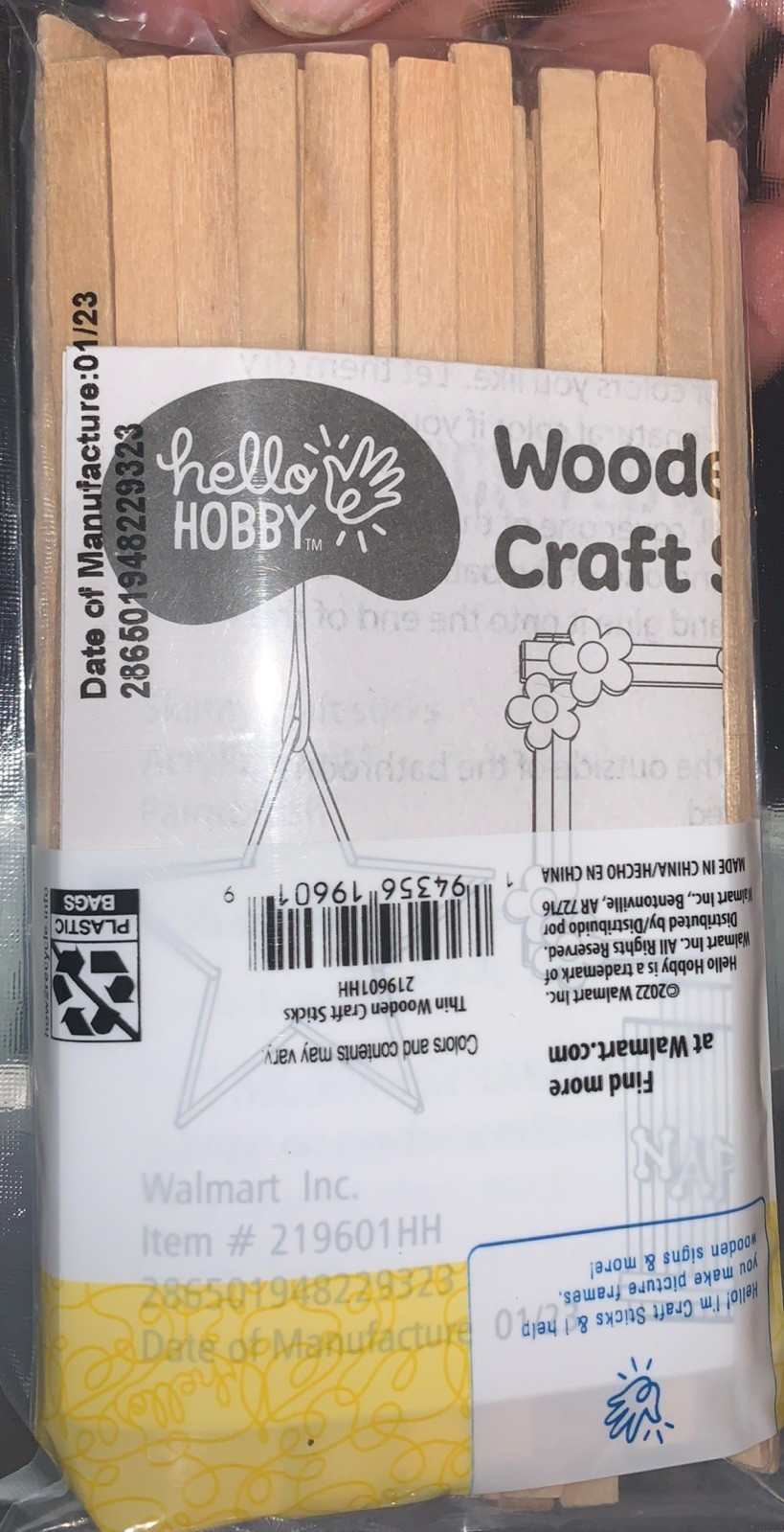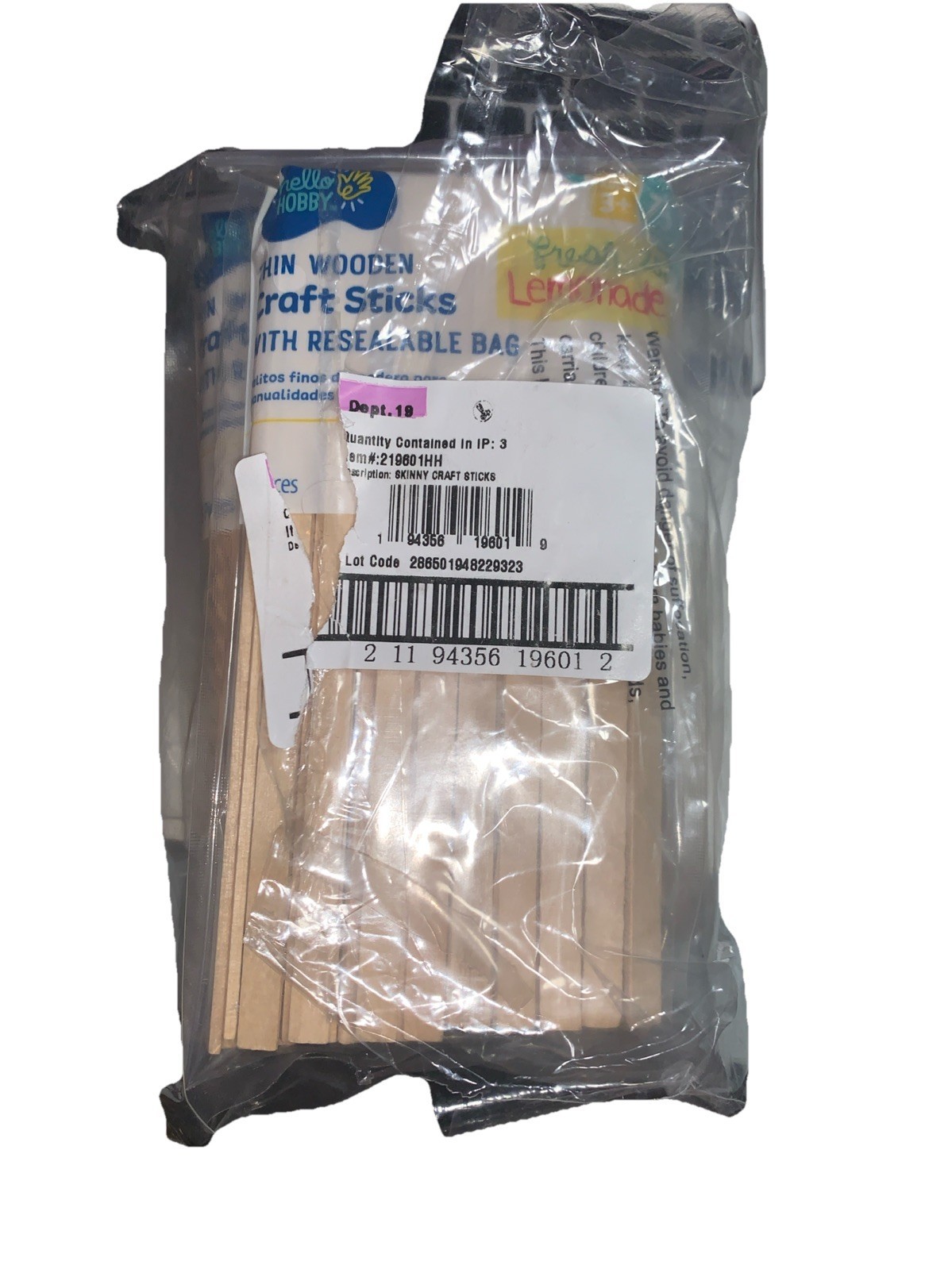 The product is a set of three thin wooden craft sticks from the brand Hello Hobby. Each stick measures 5.75"x0.27"x0.08" and comes in a resealable package. Made in China, these unfinished wooden pieces are perfect for various crafting projects. Ideal for creative individuals looking for versatile crafting supplies, these sticks are brand new and ready to be used in a wide range of crafting projects.