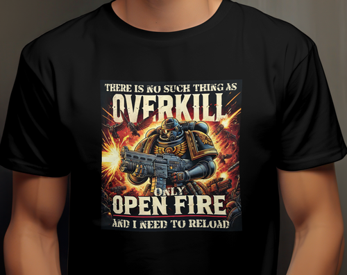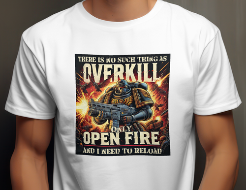 Embrace the thrill of battle with this bold t-shirt featuring a sci-fi warrior and the phrase "There is No Such Thing as Overkill, Only Open Fire and I Need to Reload." Perfect for fans of intense sci-fi action and dark humor.