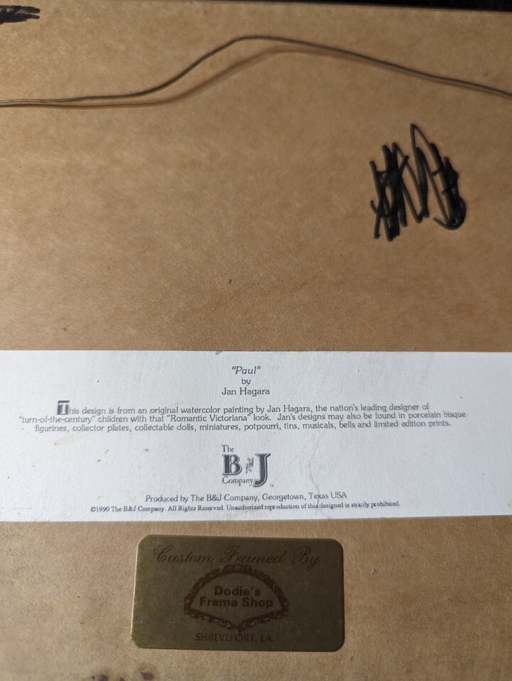'Paul' by Jan Hagara is an authorized print of an original painting produced in 1990. The portrait orientation lithograph print on matte paper measures 11 inches in length and 8 inches in height. It features a young child named Paul and is framed and matted. The print is an original and not a licensed reprint. It does not come with a certificate of authenticity and is not signed. The artwork depicts a child and falls under the theme of children and infants.