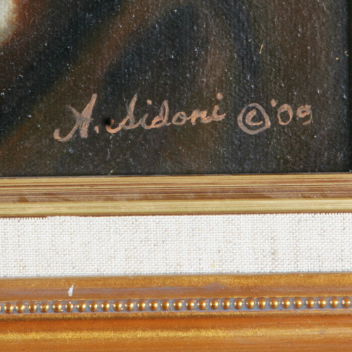 Nacido en Buffalo, Nueva York, Anthony Sidoni (1919-2012) fue un artista autodidacta con un sorprendente talento natural. Comenzo dibujando retratos cuando era niño y su habilidad pronto fue reconocida por el reconocido artista petrolero italiano, Tony Sisti, quien le dio a Anthony varias lecciones en la clase de pintura comunitaria local. A finales de los años 60, Anthony exhibio arte en un espectaculo de arte junto con el famoso artista Julian Ritter y luego recibio su primer espectaculo individual en la Galería de Jane Freeman. Fue despues de esto que Anthony obtuvo un vasto reconocimiento internacional. Vivio y pinto en West Hollywood, California, y fue votado como "Artista del año" en 2000 y 2001. (Fuente: Qart)