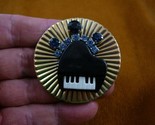 (Internal #M322-10) This is a beautiful pin/pendant made with a miniature plastic piano with white and black keys with two tone blue rhinestone accents, on a piece of circle shaped repro Victorian brass, 2-1/8" long x 2-1/8" wide. Pin/penbdant glued on the back.
