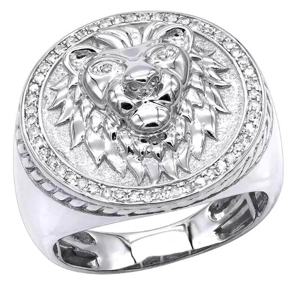 - 0.30 Ct Brilliant Moissanite 14K White Gold Over Lion Head Band Pinky Men's Ring