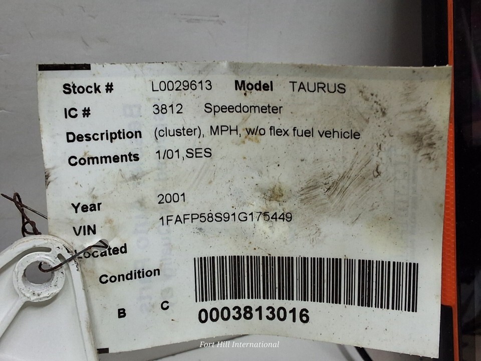 welcome to Fort Hill International Auto Parts Description 2001 to 2002 Ford Taurus MPH speedometer for vehicles without flex fuel. 112,980 mi. Verify Your Part Numbers To Ensure Proper Fit and Operation. Matching the year and vehicle is not always enough because there may be several variations of the part. This Is Your Responsibility To Make Sure The Part Is What You Need, And Will Work With Your Application. Your Part Numbers Need to MATCH To Be Sure! If you are purchasing any item that is electronic in nature such as Radio's, Control Modules, ECM, ECU, Please be aware that you may have to have the item programmed in order to function with your vehicle. Some will simply plug and play without programming. We Do NOT Supply Radio Unlock codes, They can be accessed from your local dealer, or manufacturers web site. T531-3813016 Payment Ready to order? We accept Paypal which allows you to pay with most major credit cards. Shipping We ship all orders within 24 hours. However it is up to you to choose the speed in which your item will arrive. All items come with free tracking which is uploaded to you once the postage is generated. We offer several shipping options please be sure to choose the one that will work best for you. Remember shipping times are only estimates and in no way a guarantee of arrival time. Terms of Sale Thank you for choosing Fort Hill International. All of our parts are used and in good working order when removed from the donor vehicle. Some electronic parts will have to be programed by a dealer or mechanic in order to work properly. Some Radios will require codes to "Unlock" them, others just plug and play. RDS Radios almost always have to be dealer installed. Codes can be obtained from your local dealer or over the net by typing "radio codes" into your browser. We do not supply codes or cover installation expense. If your unsure if your part needs programing contact us or your dealer before purchase and we will do our best to help you out. . Contact Us Email with specific Questions, Its up to you to verify interchange and that this is the part you need. Return Policy 1. Please contact us before returning any item, Lets try to work it out first. 2. All parts are used and in good working order to the best of our knowledge. At times your dealer may have to reprogram your vehicles computer in order for the replacement part to work correctly. This Includes Some Radios, Modules, and Computers. Some Will Simply Plug N Play. 3. If your order had free shipping on it, the original shipping charges will be deducted from the refund. If it is our error we will refund your original shipping charges. You are still responsible for returning the item. 4. Buyer Pays Return Shipping. 5. As is parts are just like it says and are not returnable for any reason. 6. We do not guarantee color matching on parts. 7. All costs associated with installation are the buyers responsibility. 8. You are responsible for making sure you are ordering the correct part for your application. 9. In the event you need to return your item please make sure the original tag is included. All of our parts are marked prior to shipment for identification purposes. These ID marks must be on the part in order for the return to be accepted 250+ Listing Templates! Auctiva gets you noticed! The complete Selling Solution. Track Page Views With Auctiva's FREE Counter