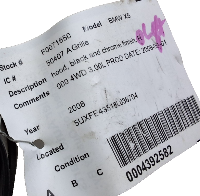 2007 through 2013 BMW X5 left driver's hood mounted grill assembly.