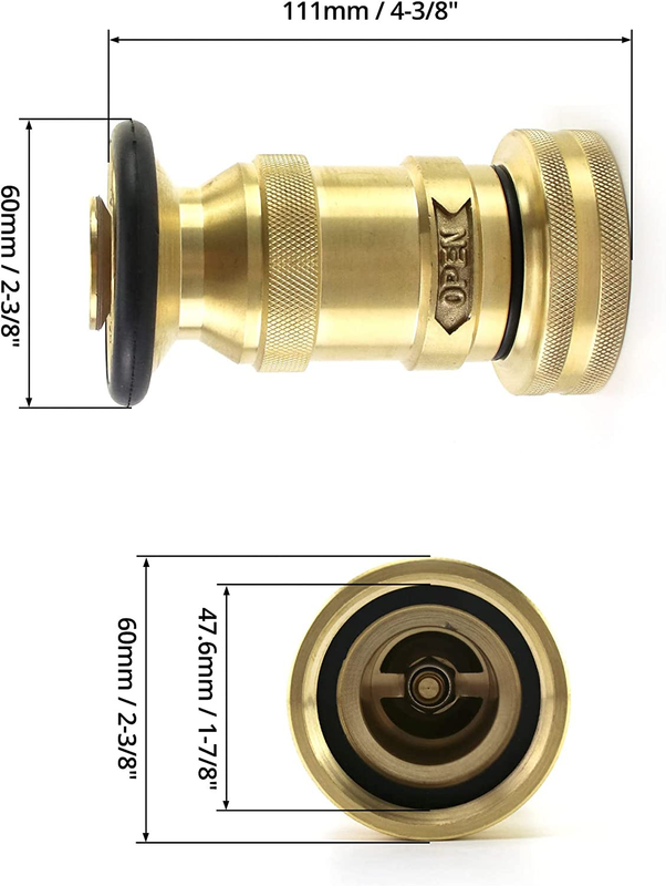 Turn to control on and off and adjust the spray size, from DC to mist for multi-purpose. 100 psi maximum pressure (water only). Brass housing and brass valve stem, corrosion resistant, resistant to high temperature and impact, 1-1/2" cast brass adjustable atomizing nozzle.