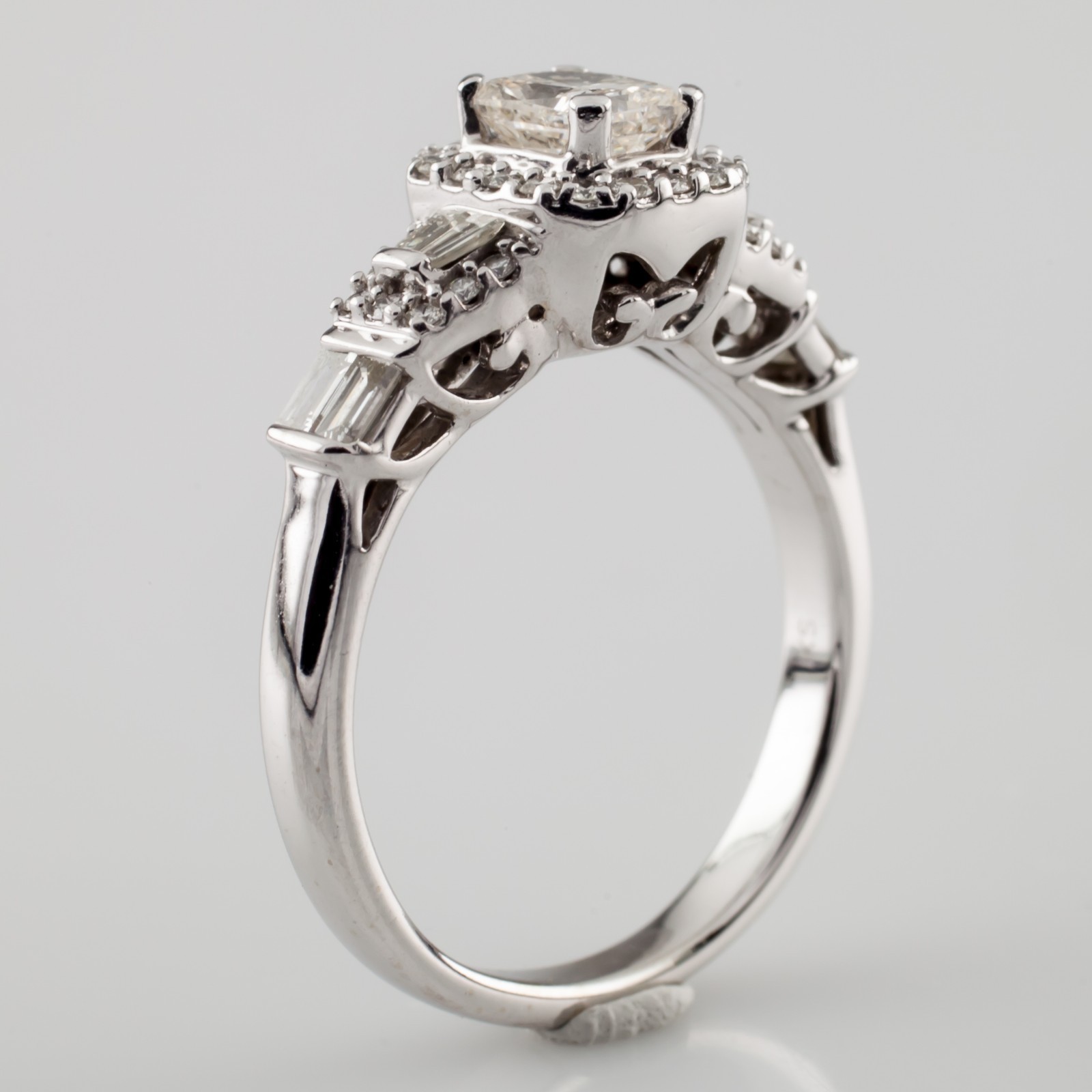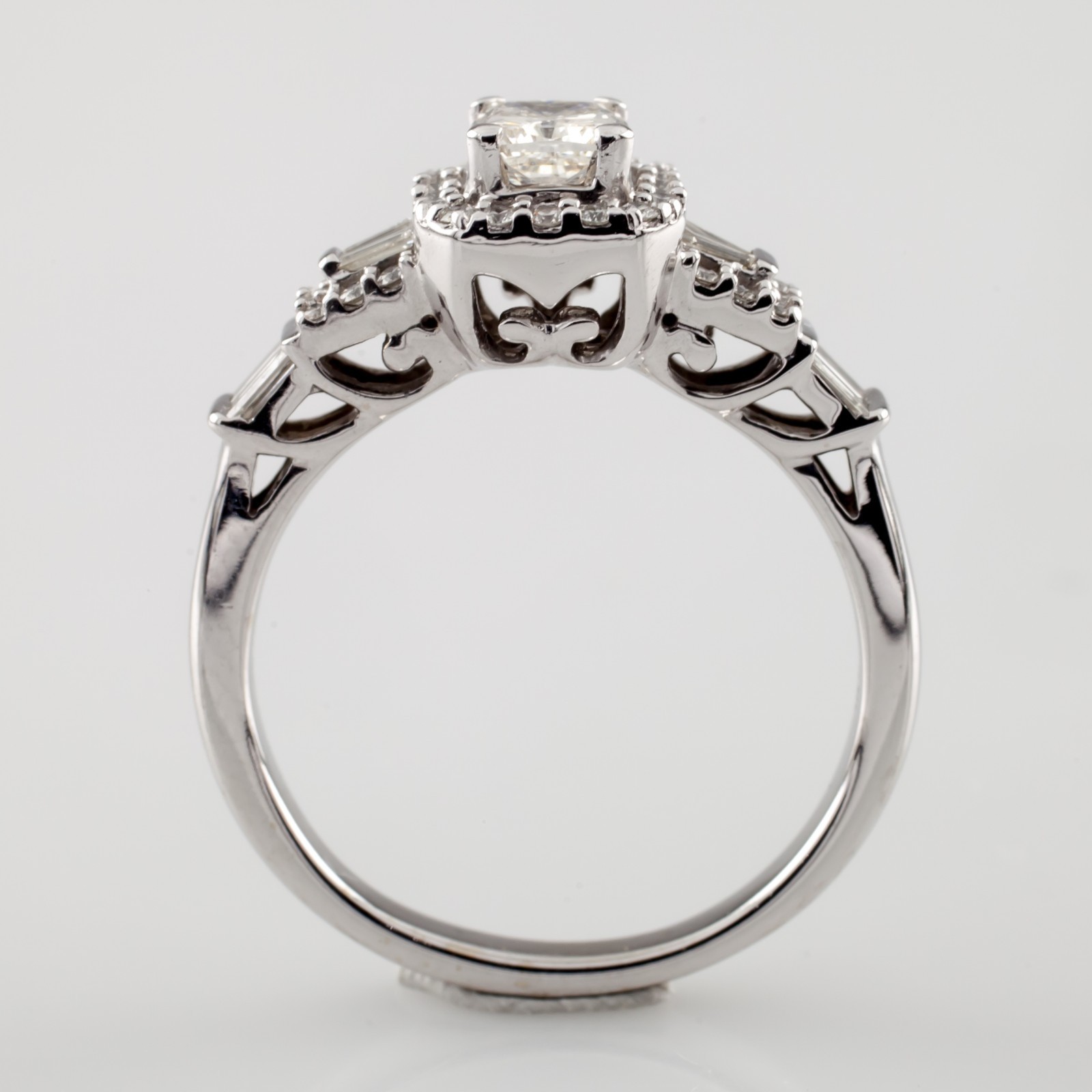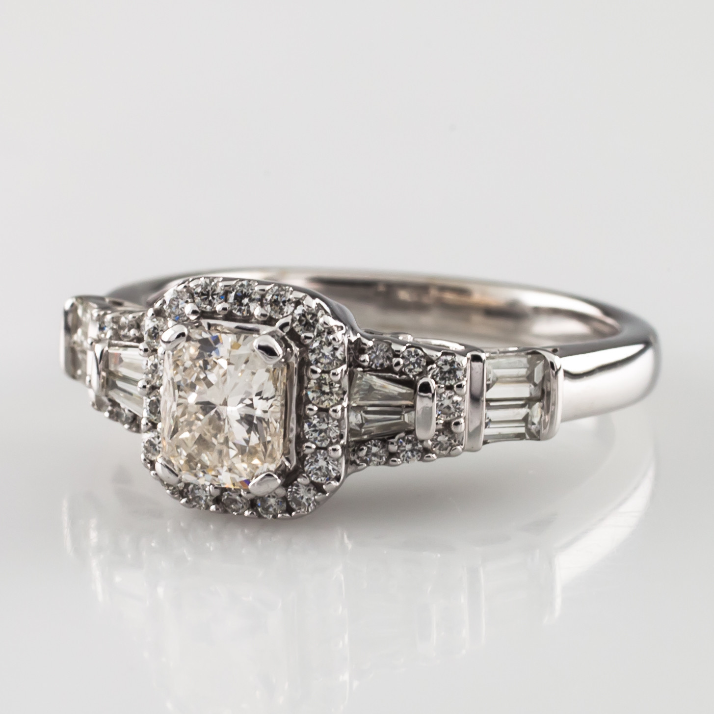 Features 0.65 ct Radiant Center Stone with Round Diamond Bezel and Baguette Accent Stones