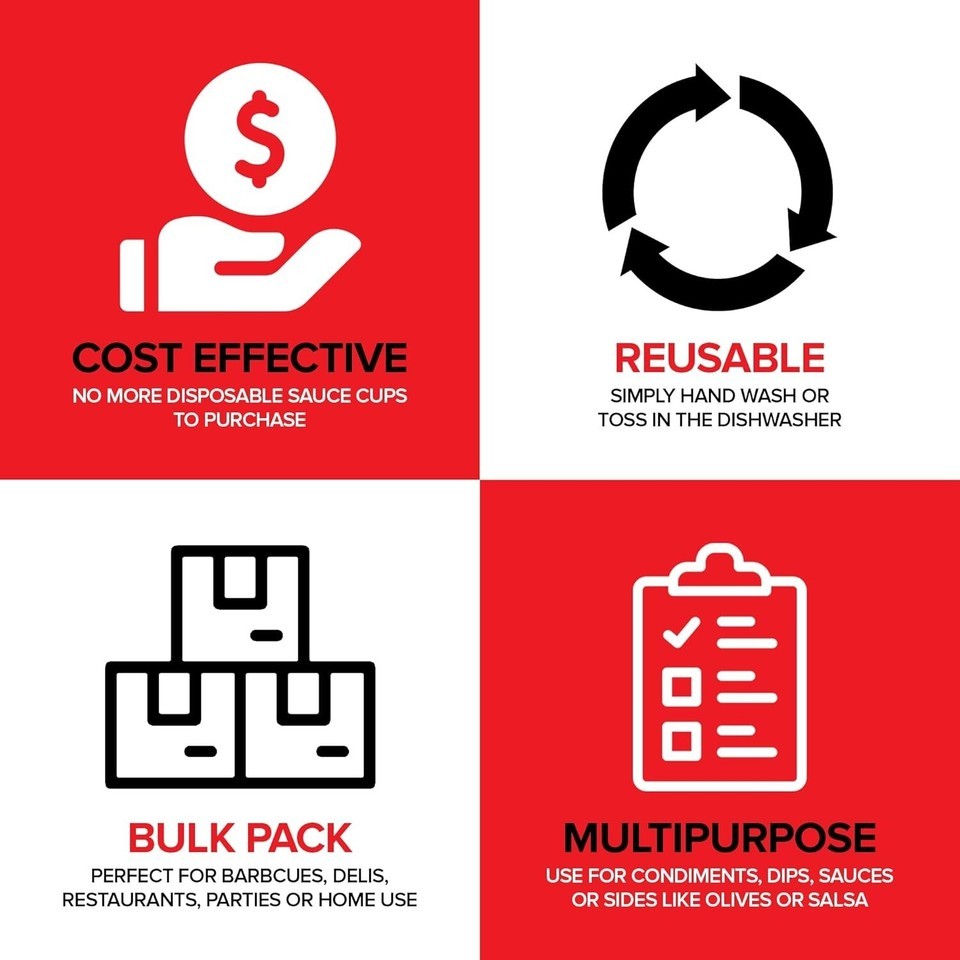 Efficient Alternative: Trade costly and wasteful disposable dipping sauce cups for our 12 pack reusable condiment cups, a cost-effective and elevated way to serve your traditional condiments signature sauces