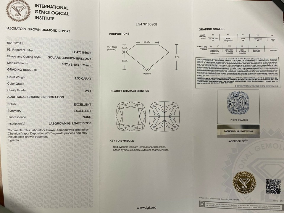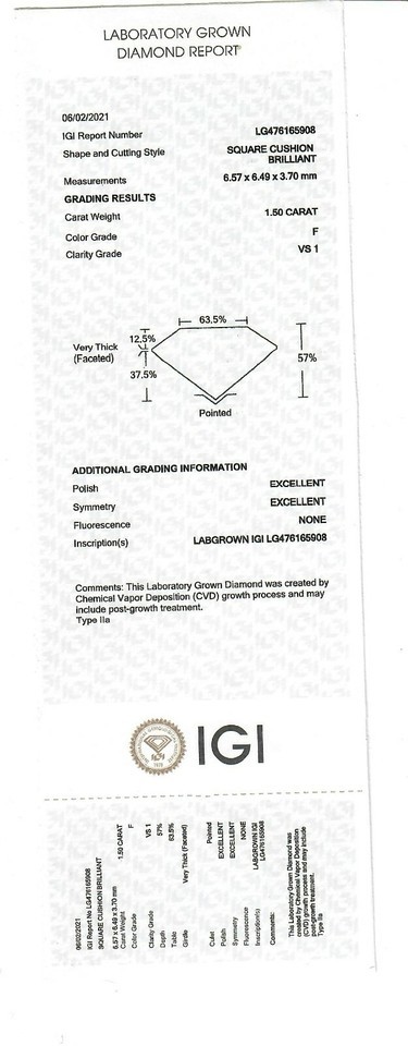 - 1.50 Carat Cvd Faux Diamonds Grown Cushion Cut Diamond F VS1 Igi Certified- s...
