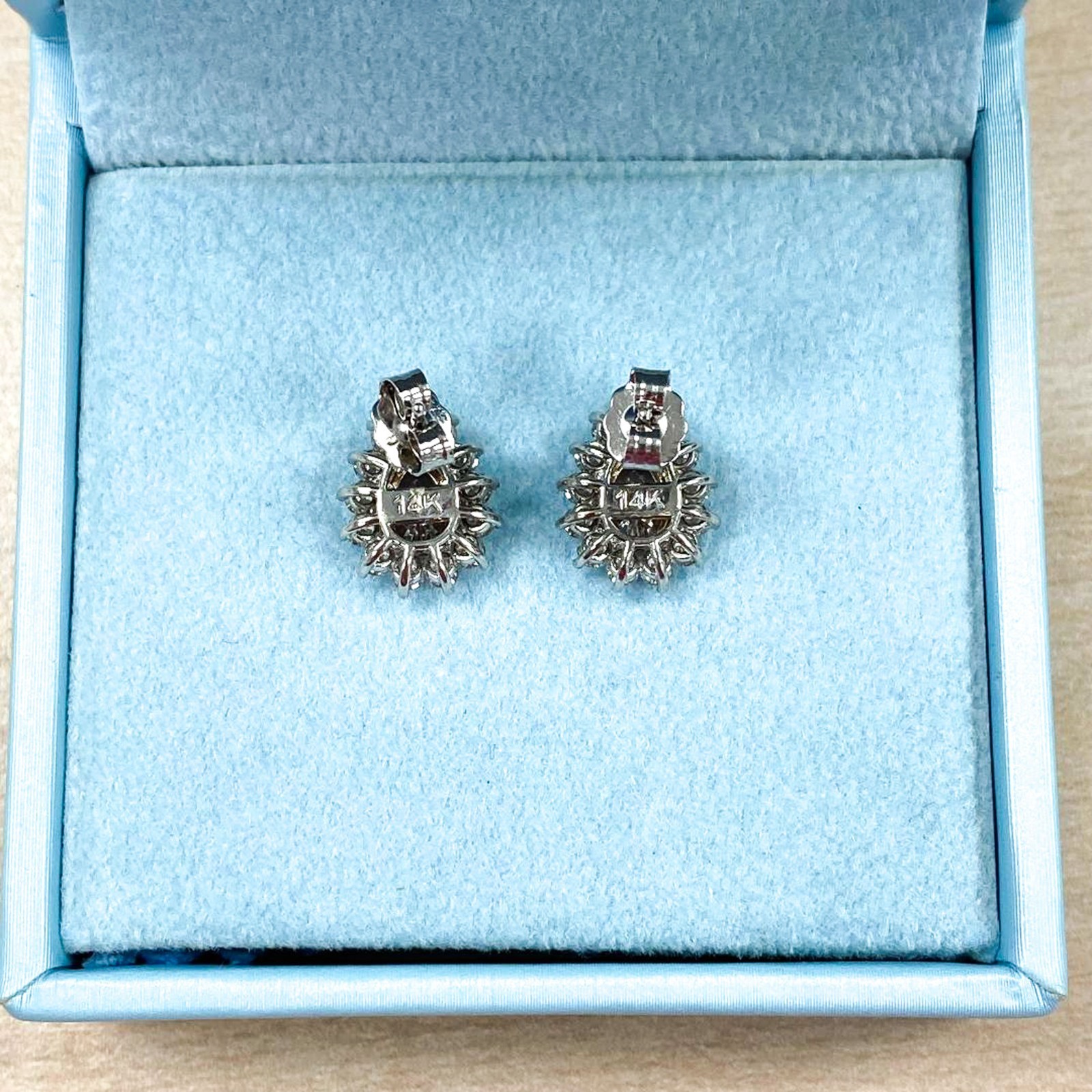 These stunning halo stud earrings are crafted in 14k white gold and feature lab-grown diamonds in a radiant sunburst design. Each earring showcases a colorless round-cut lab-grown diamond at the center, surrounded by shimmering diamond rays that emulate the brilliance of the sun. Elegant and eye-catching, they?re perfect for adding a touch of Sparkle to both everyday looks and special occasions. The total carat weight 1.56.