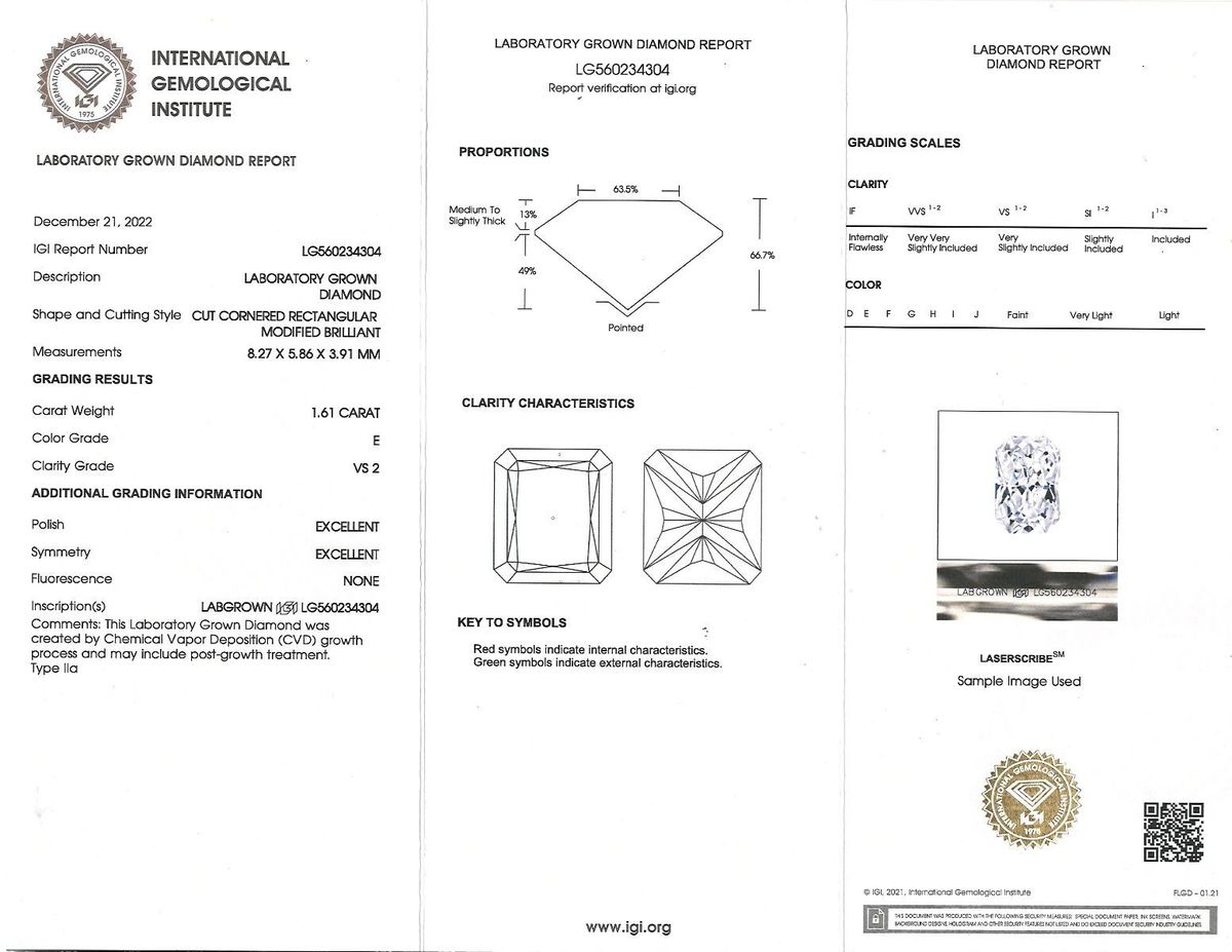 Dieser IGI-zertifizierte, im Labor gezüchtete 1,61-Karat-Diamant im Strahlenschliff bietet eine schone und umweltfreundliche Alternative zu traditionell abgebauten Diamanten und behalt gleichzeitig die gleiche Qualitat und Schonheit bei, die Diamantenliebhaber von runden, erdabgebauten Diamanten im Brillantschliff erwarten. Das Gesamtkarat -Gewicht betragt 2,33 Karat.