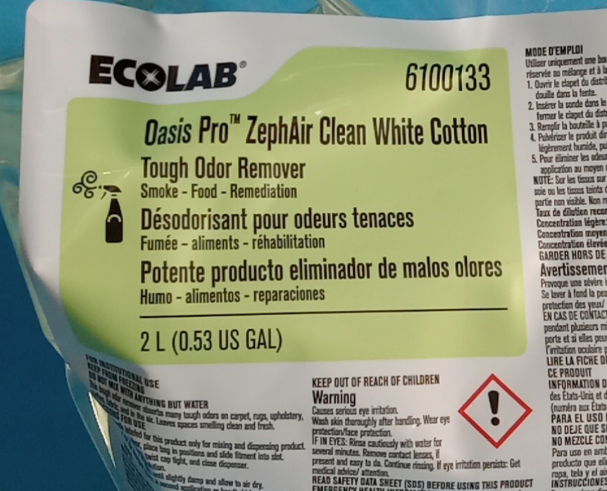 1 Bag ECOLAB 6100133 Oasis Pro ZephAir Clean White Cotton Tough Odor Remover 2L