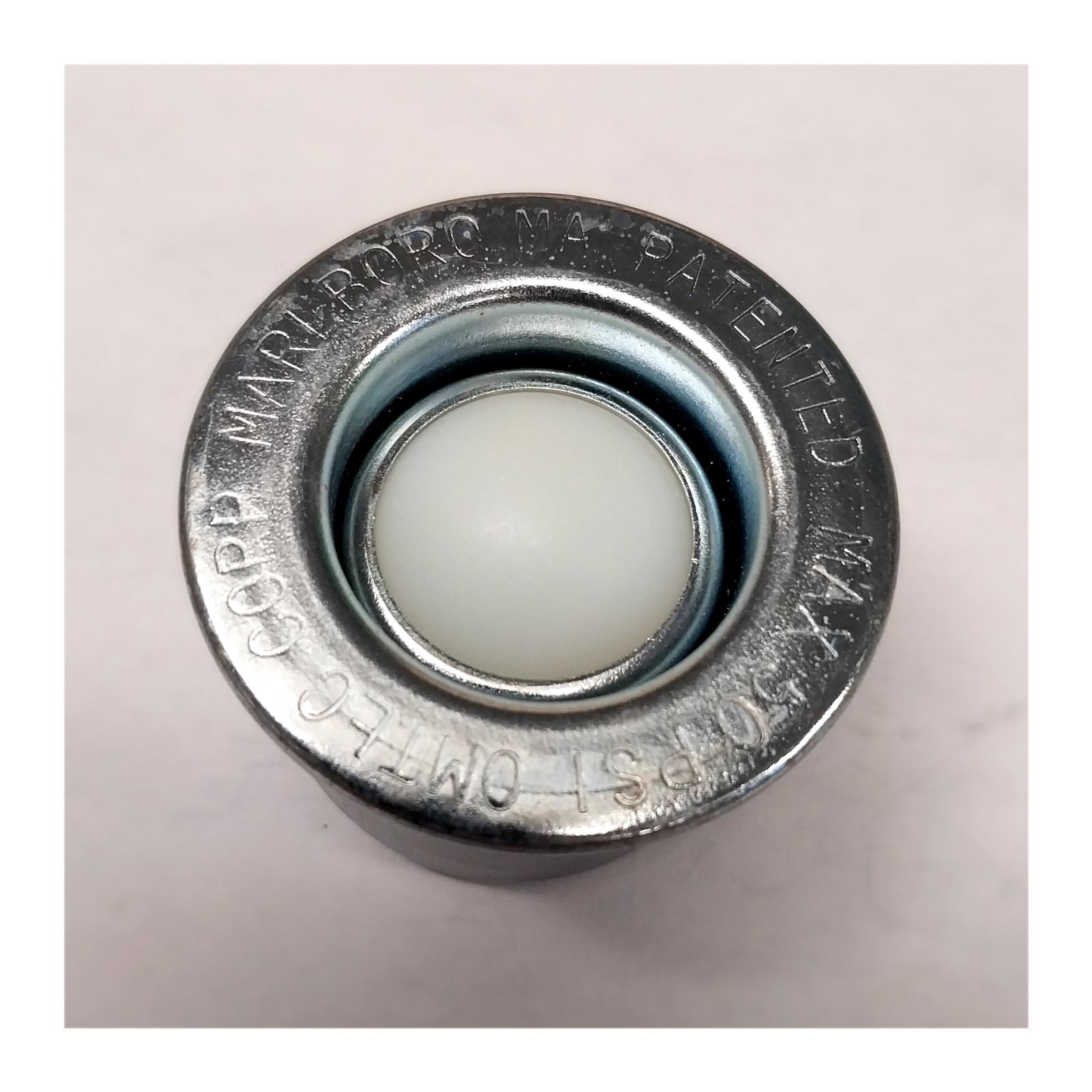 Omtec Corp PBT-1 Ball Transfer is a type of material handling equipment used for conveying and transferring heavy loads. The device consists of a ball bearing mounted in a housing, which allows for smooth and easy movement in any direction. The PBT-1 model is designed to handle loads up to 50 lbs each and is suitable for use in a variety of industrial and commercial applications, such as packaging, assembly lines, and shipping and receiving areas. It can be installed on flat surfaces, and it's made of steel for durability and resistance to wear. The Ball transfer units are often used in combination with other types of material handling equipment, such as conveyors and pallet jacks, to create a complete material handling system. Omtec Pop Up Ball Transfers like virtually all pneumatically operated components, require Filtered, Regulated and Lubricated compressed air to operate. Omtec has FRL kits, Non-detent foot valve kits and detent toggle hand valve kits available. Other controls supplied on request. The regulator should be set at 50 PSI (3.447 bar). Omtec pop up ball transfer units use very low air volume, it is usually not a consideration. Each up and down cycle of one ball uses .00038 cubic feet (.0000108 cubic meter). Virtually any air control device may operate Omtec Pop Up Ball Transfers. In the majority of applications simple non electric foot and hand valves may be used. Sensing device operated electric solenoid. The Diameter of the ball is 1 inch. The diameter of the can is 1.562 inch. The diameter of the flange is 1.850 inch. If your application calls for ball transfers chose Omtec.