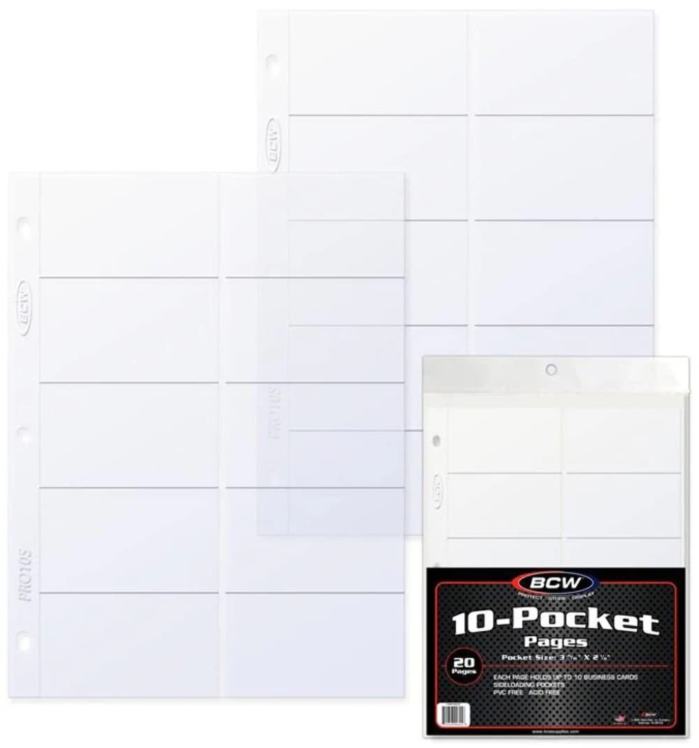- 1 pk of 20 BCW 3 ¹⁵⁄₁₆" x 2 ⅛" Business Card 10-Pocket Side-load Pro Binder Pgs