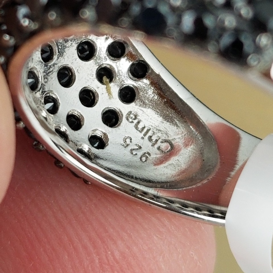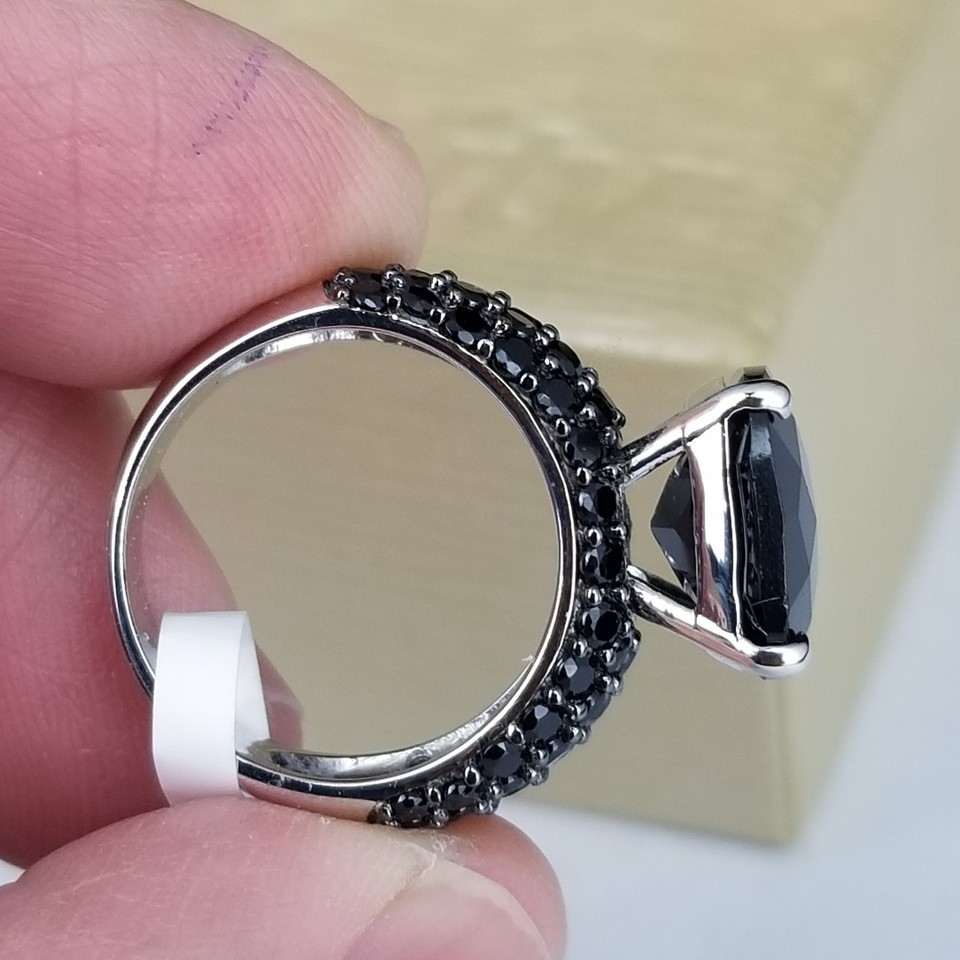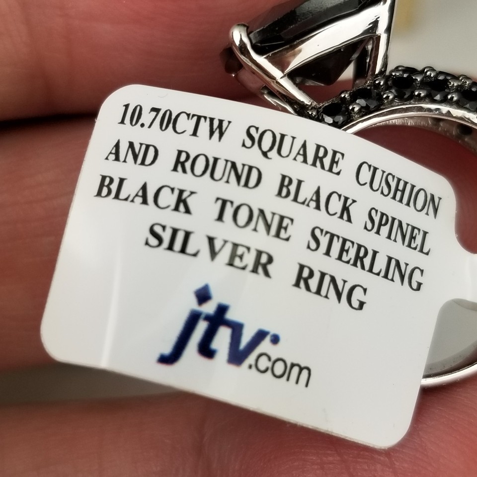 Marked 925 on the inside of the ring. Marked 10.70CTW square cushion and round black spinel black tone sterling silver ring, etc. on the tag.