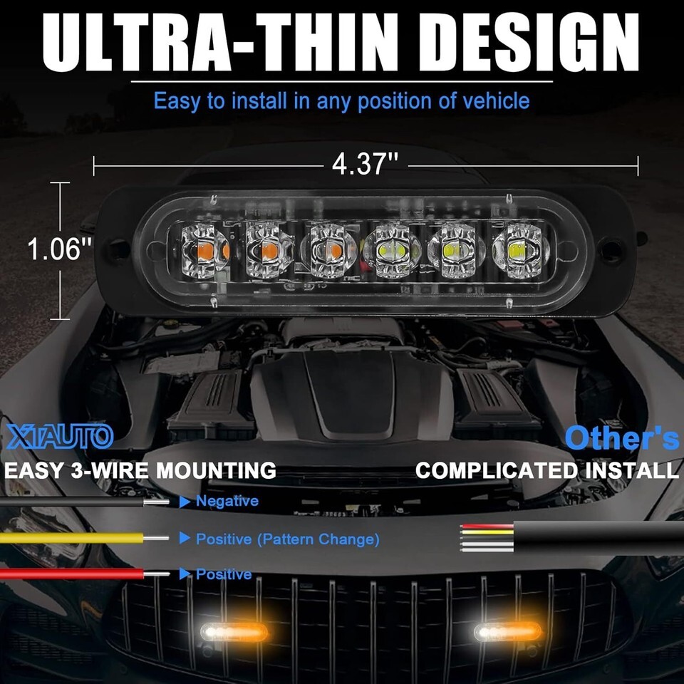 ?EASY 3-WIRE MOUNTING?Ultra-thin design, easy to install in any position of vehicle, foam rubber pad included, shock-absorbing, scratch-resistant, no damage to vehicle body. Red wire to positive, Black wire to negative, Yellow wire to positive for pattern change. (Release the yellow wire, the mode will fixed).