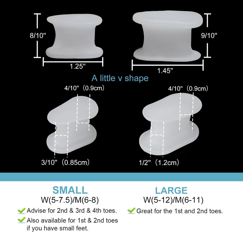 Our small spacers work perfect to use on second toe and third toes. The thick spacer is wide enough to separate toes.