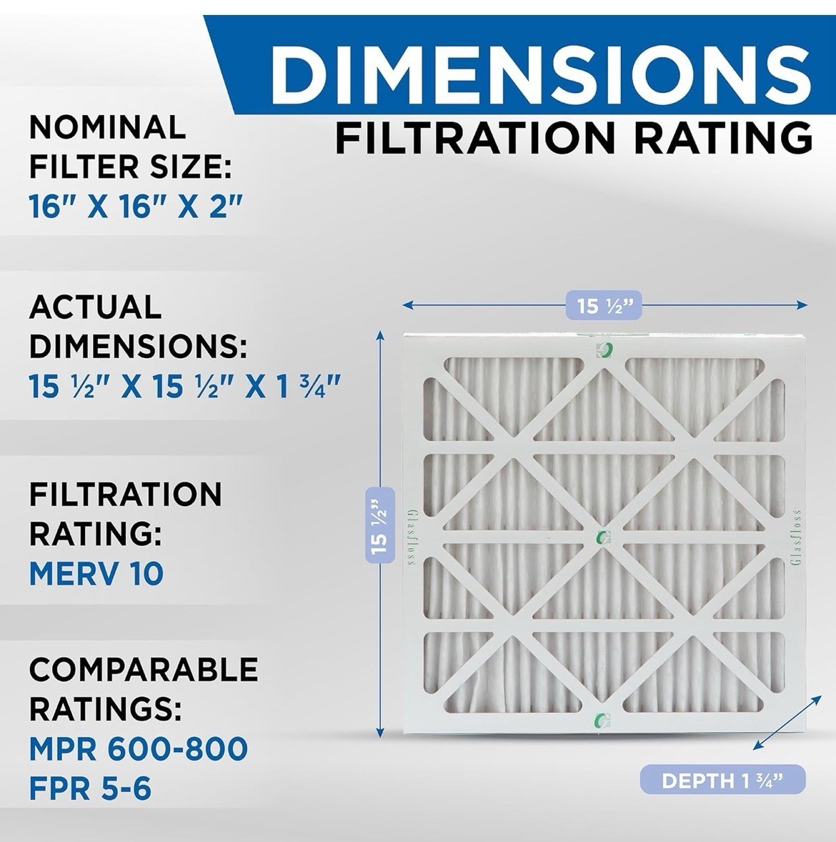 The Glasfloss ZLP16162 Z-Line 16 x 16 x 2 MERV 10 Pleated Filter 10 Pack is a high-quality air filter designed to improve the performance of your heating and cooling system. Made by Glasfloss, a trusted brand in the industry, this filter is specifically crafted to capture particles as small as 10 microns, making it an ideal choice for those with allergies or asthma.