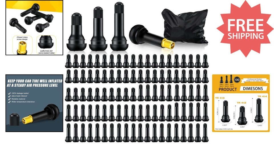 Upgrade your vehicle maintenance kit with our comprehensive set of 100 tubeless tire valve stems, including 50 TR413, 25 TR412, and 25 TR414 pieces. Crafted from durable brass and ozone-resistant rubber, these high-quality, easy-to-install snap-in valve stems are designed for long-term reliability and compatibility with most cars, trucks, trailers, and motorcycles. Their standard size makes them perfect for a variety of applications, ensuring your tires stay properly inflated and your vehicle runs smoothly. Whether for daily use or replacements, stock up now for dependable performance and convenience.