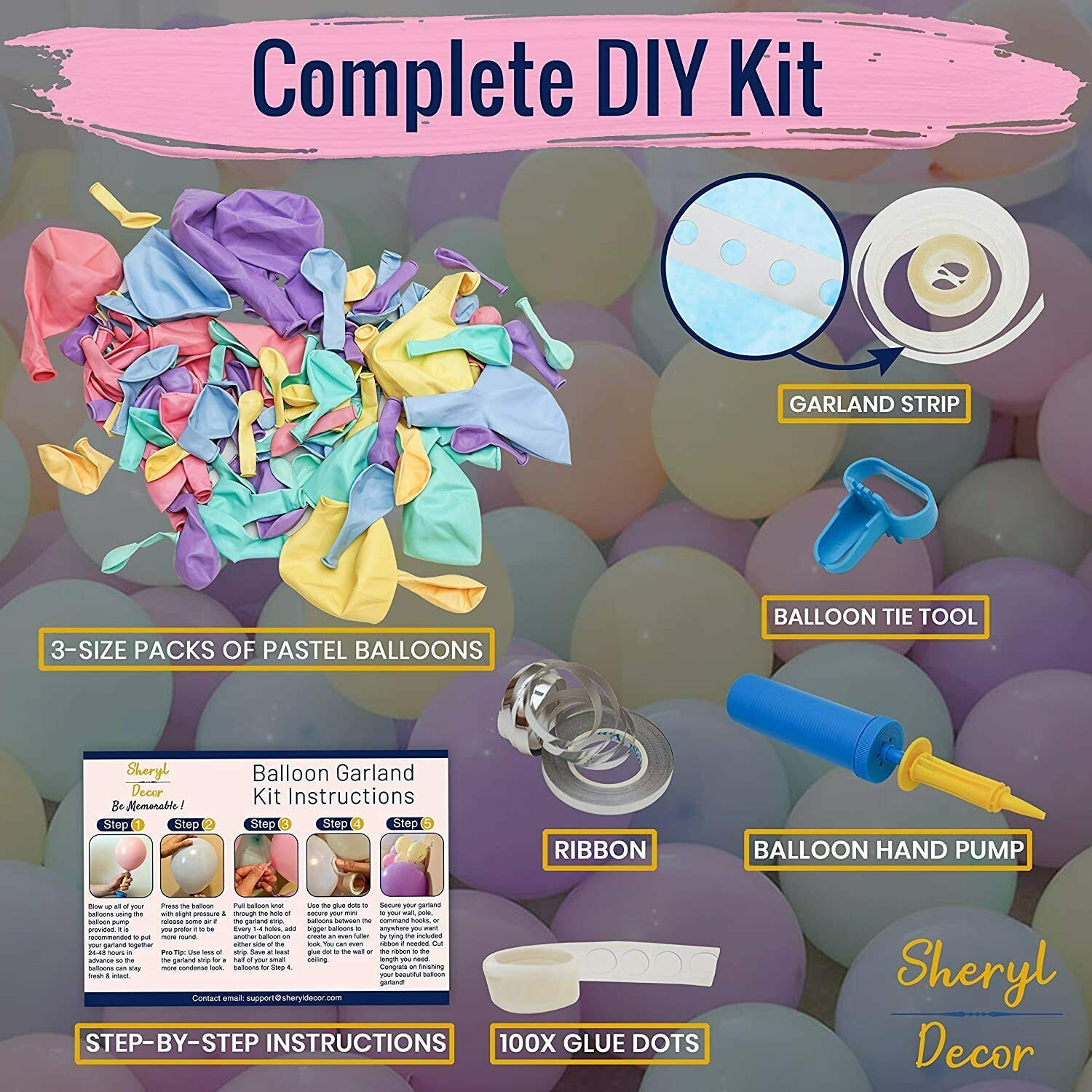 And, (1) 100x glue dots, (1) 16ft balloon garland strip, (1) balloon tying tool, and 32 feet of Ribbon