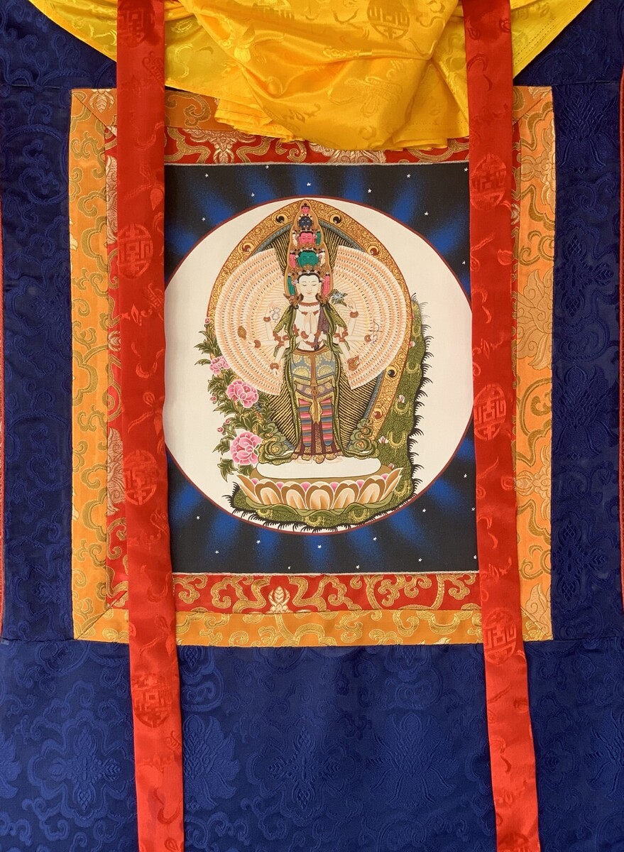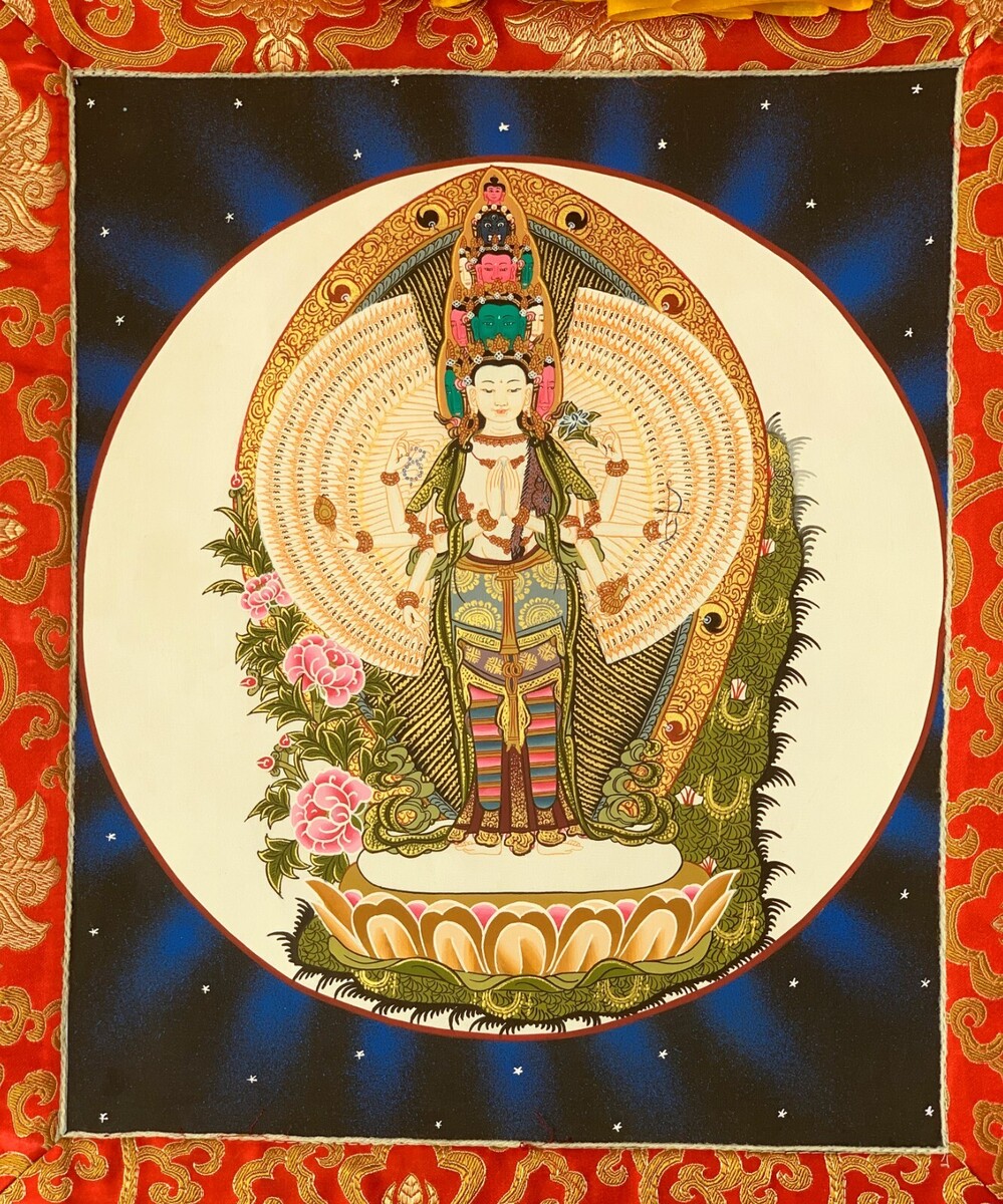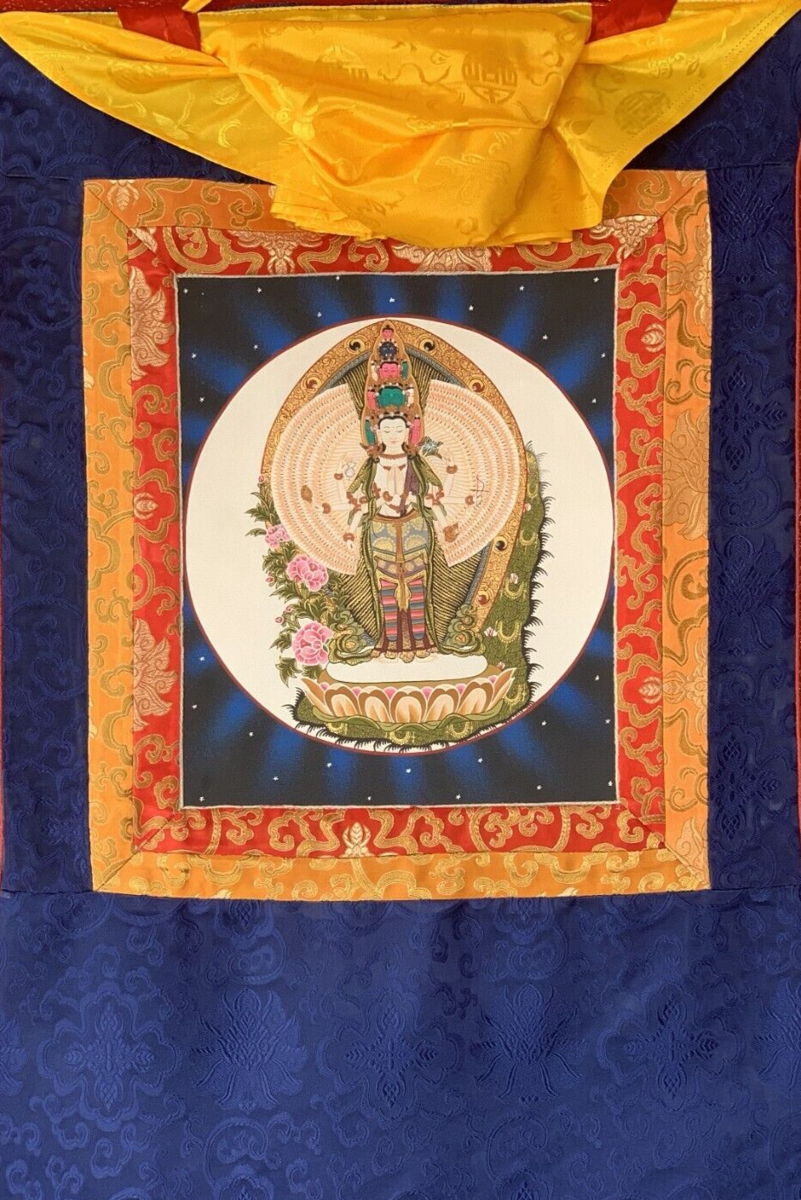 - 1000 ARMED AVALOKITESHVARA CHENREZIG ORIGINAL THANGKA PAINTING WITH SILK BROCADE