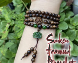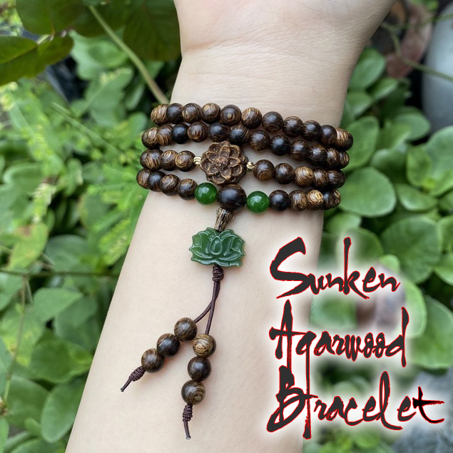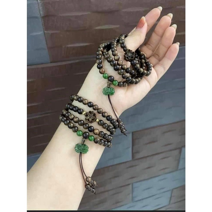 108 Bead Sunken Agarwood Bracelet with Lotus & Green Stone, Size 6/7/8mm