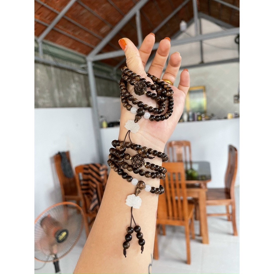 This 108-bead Sinking Agarwood Bracelet is handcrafted from premium high-oil agarwood layers ("Sánh Chìm") – known for its rich, long-lasting scent and natural energy. Each bracelet is made from carefully selected wood with a warm, earthy tone that may vary slightly due to the uniqueness of each agarwood batch.