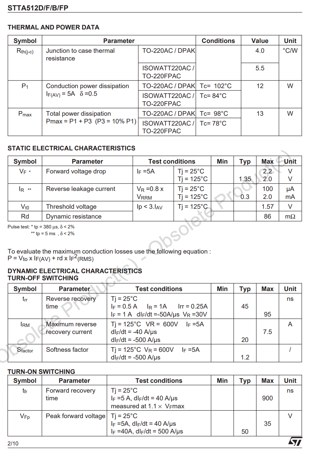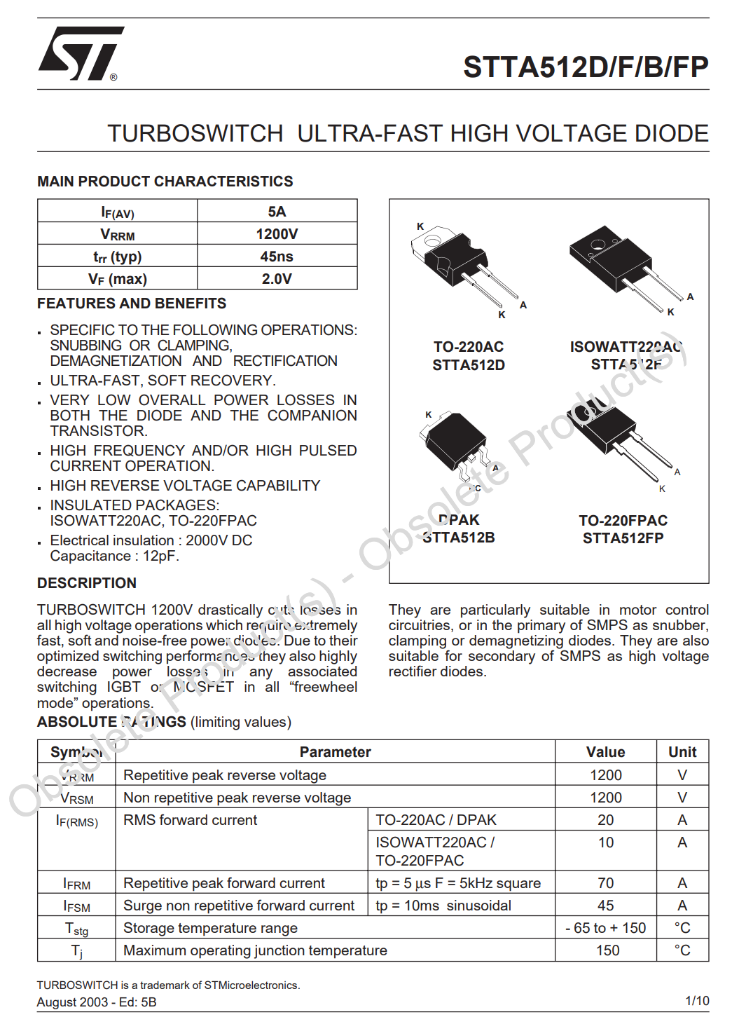 - 10PCS STTA512FP STM Ultra Fast High Voltage Diode 1200V 5A Rectifier TO-220FP