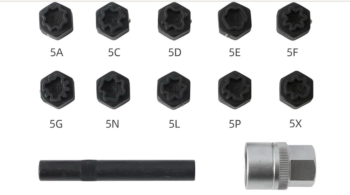 The wheel lock lug nuts removal set includes 10pcs key adapters(5A,5C,5D,5E,5F,5G,5N,5L,5P,5X), 1pcs 1/2inch square 21mm hexagon socket and 1pcs 90mm extension bar, it can be used together, even if you lose the key, you can pull out the key from the socket and remove the locking wheel bolt.