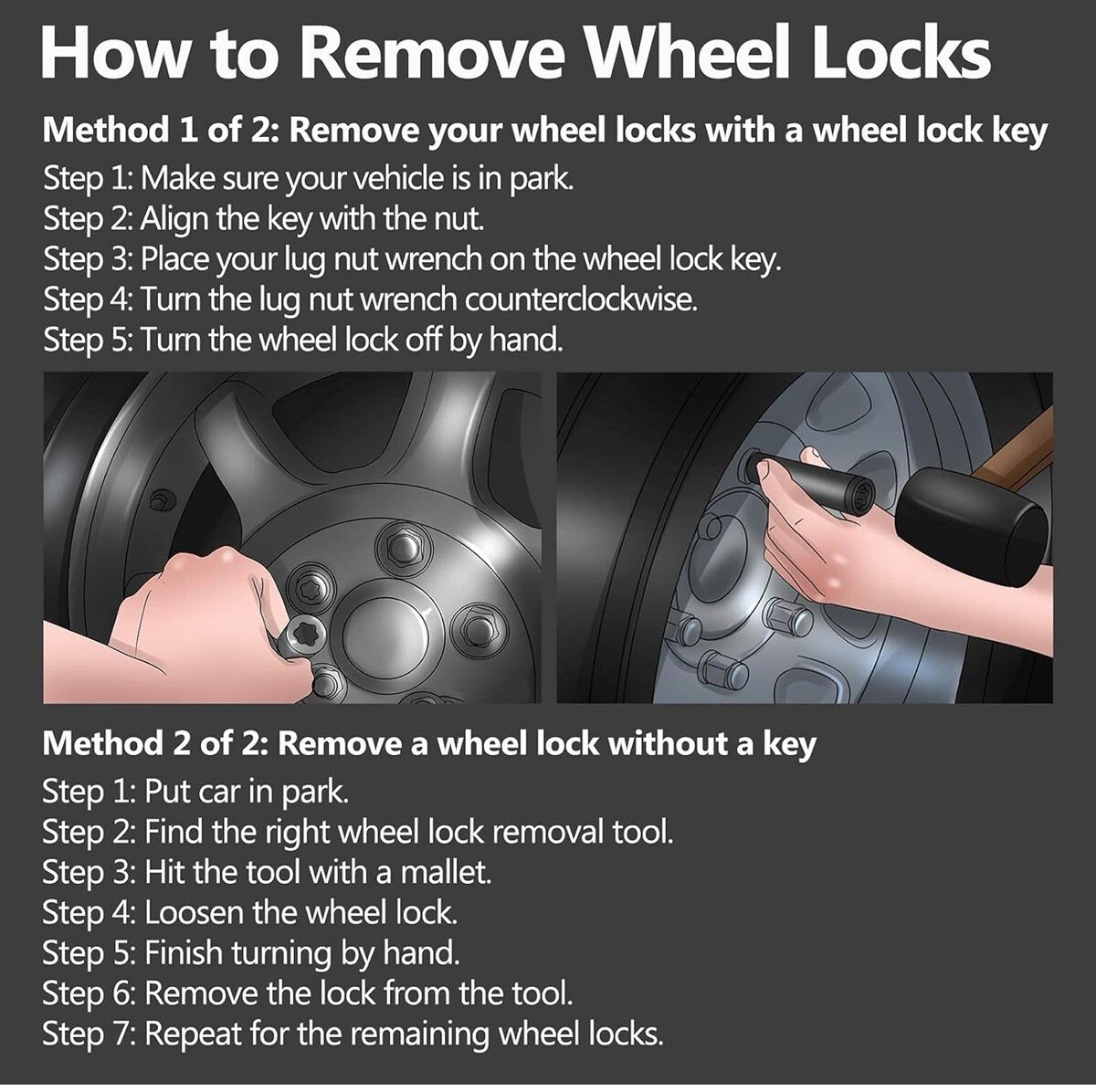 Please purchase a suitable wheel lock lug nuts removal set according to the shape and mark of your wheel anti-theft screw. Do not use excessive force to damage the lugs.