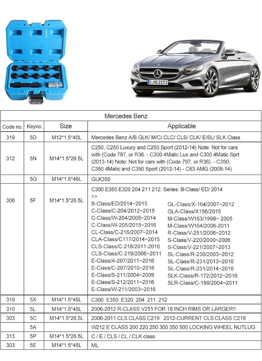 12pcs wheel lock lug nuts removal set used for removing and installing locks of most Mercedes Benz model, with a 1/2inch drive socket adaptor and a 90mm extension bar, make your operation easy and convenient