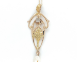 Victorian 10k yellow gold lavaliere pendant with a small diamond and pearl dangle. There is an applied yellow gold leaf. The round diamond measures about 2mm, and the freshwater pearl measures about 4.5mm.