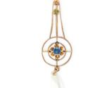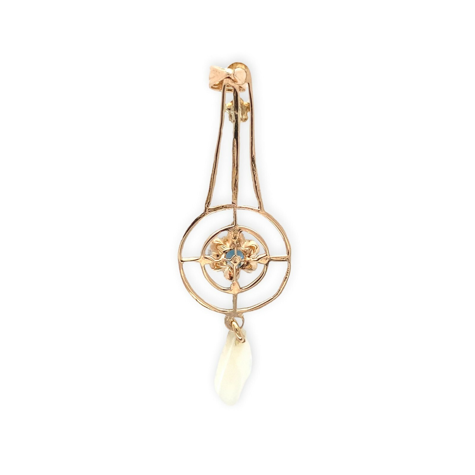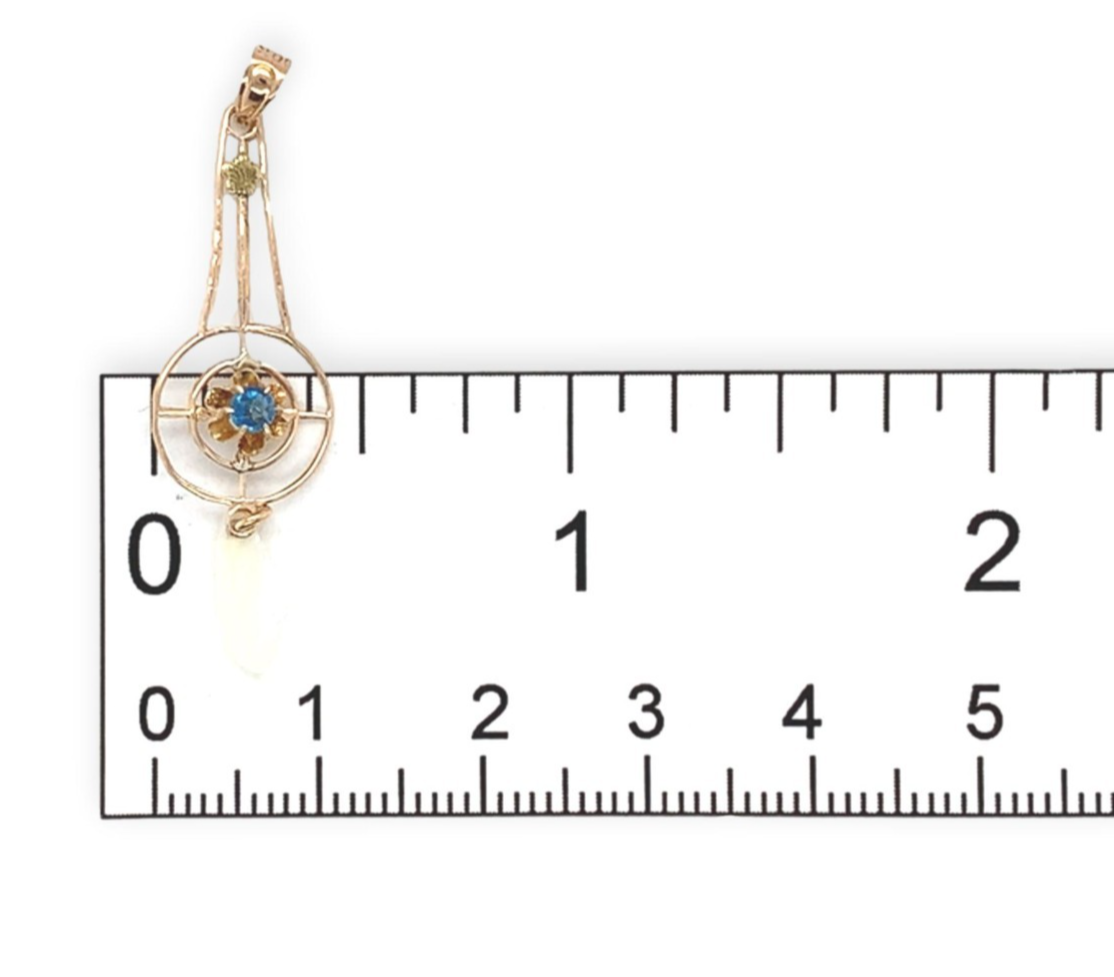 Victorian 10k yellow gold lavaliere pendant featuring the original blue paste stone and an iridescent shell drop. The round blue stone measures about 3mm, and the freshwater pearl drop measures about 10mm long. The lavaliere measures 1 1/2" long with bail and dates from about 1900. The pendant weighs 0.36 dwt. Lovely!