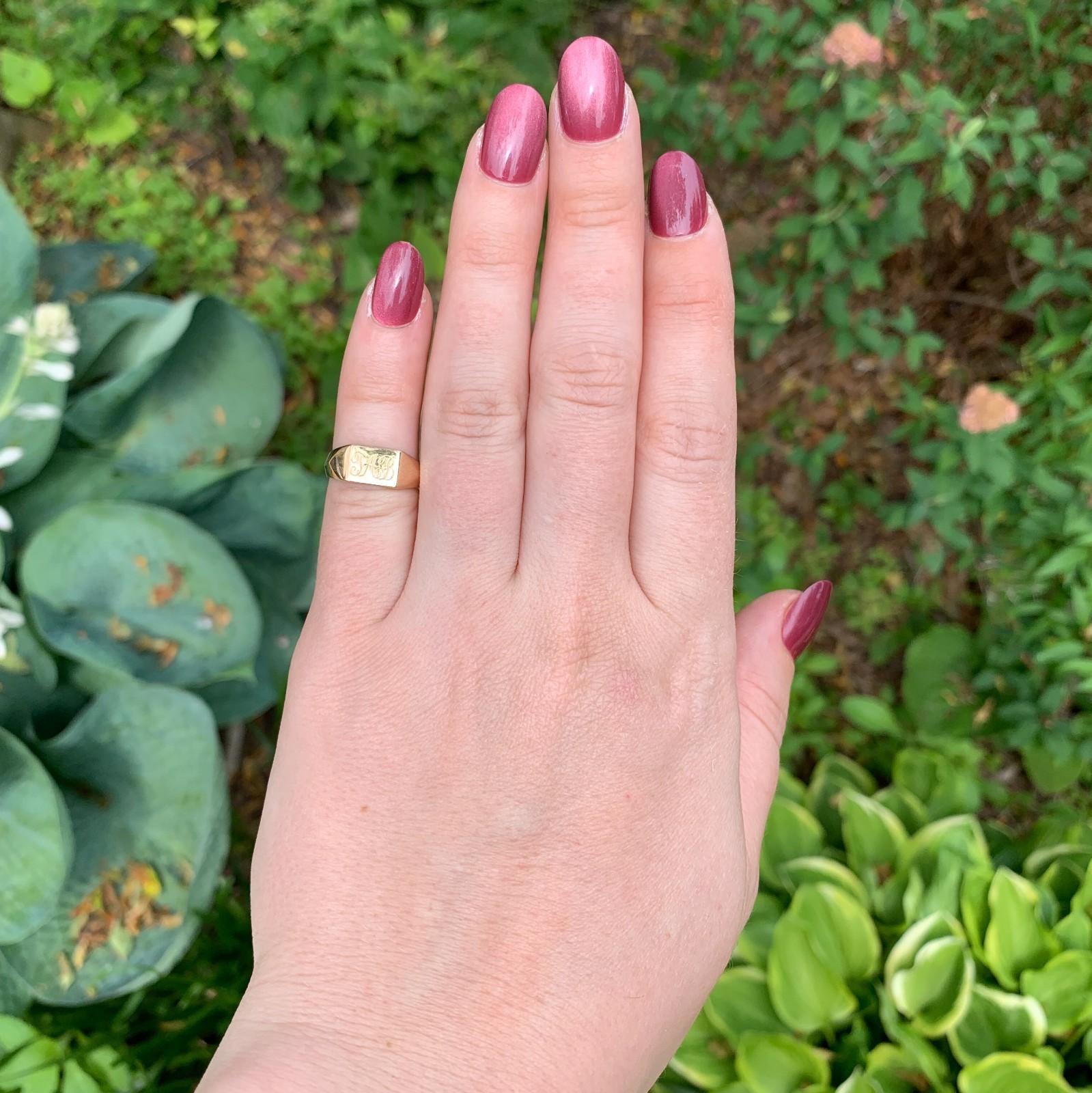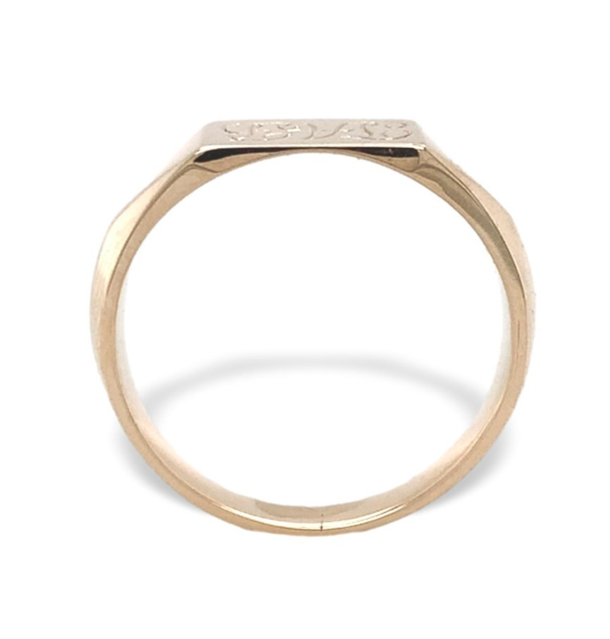 10k yellow gold signet ring with engraved initials that appear to be "TAB". The ring measures 6.5mm wide. It hallmarked 10k crown M. The ring fits a size 3.75 finger, weighs 1.45 dwt., and is contemporary. Wonderful!