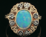 Vintage 10k yellow gold ring with eight applied white gold flowers featuring a 1.05 carat Australian opal. The genuine natural oval opal measures about 8.5mm x 6.5mm. It has primarily green flash with all color play of color. The ring fits a size 7.5 finger and weighs 1.68 dwt. It dates from the 1940s. Lovely!