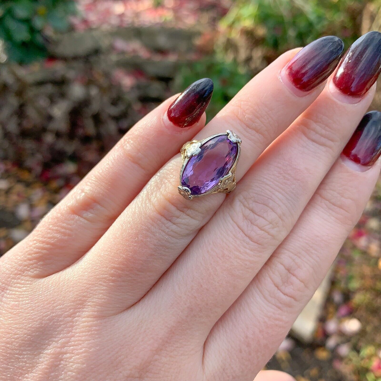 10k Yellow and White Gold Filigree Genuine Natural Amethyst Ring Flowers #J6346
