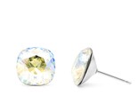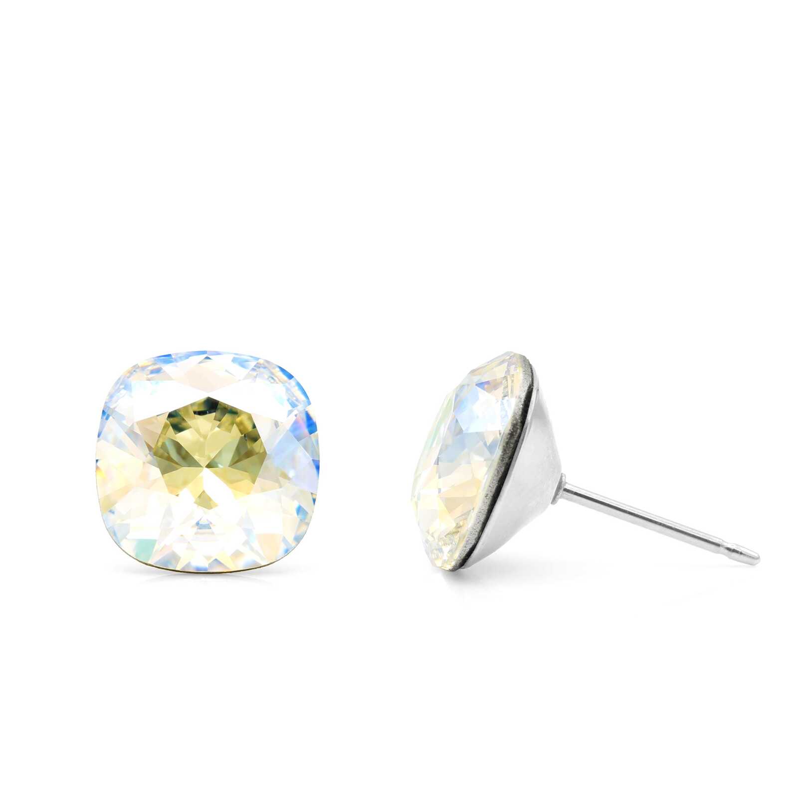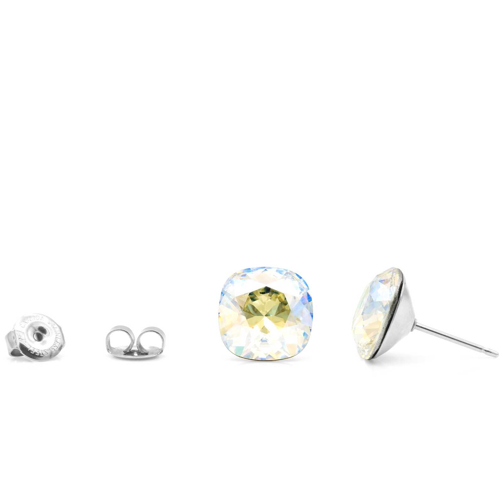 - 10mm Iridescent Swarovski Cushion Cut Stud Earrings with Hypoallergenic Surgical