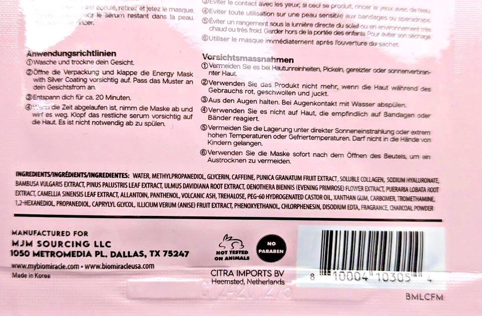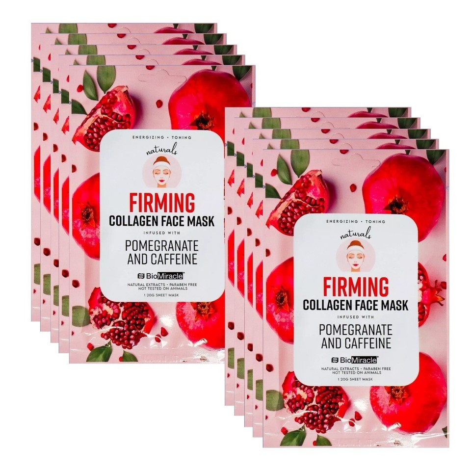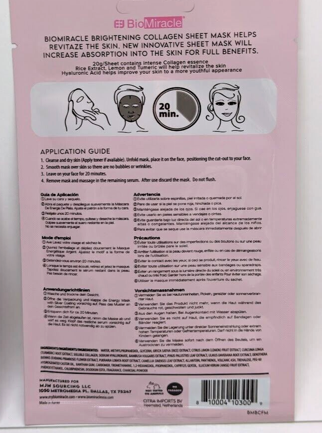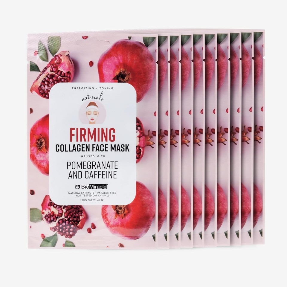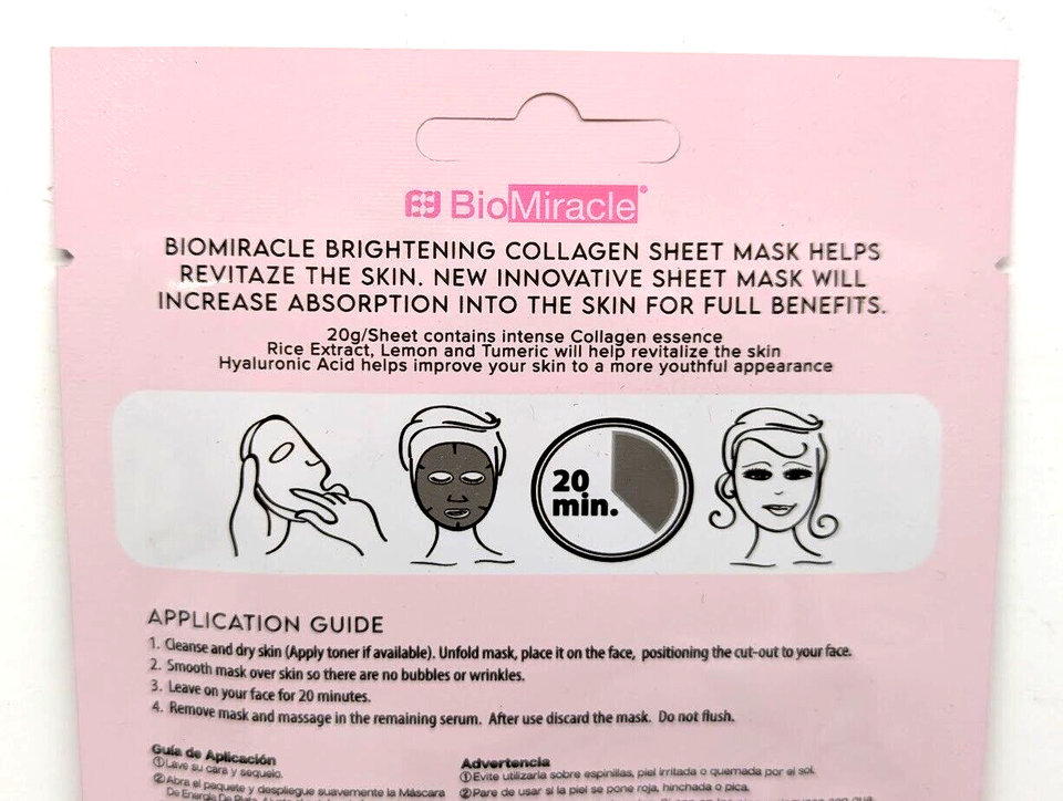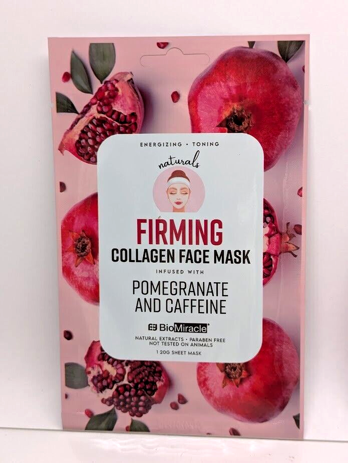 BioMiracle Firming Collagen Sheet Mask helps to energize and tone the skin. New innovative sheet mask will increase absorption into the skin for full benefits. Pomegranate and Caffeine to stimulate the skin. Hyaluronic Acid helps improve your skin to a more youthful appearance.
