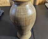 This 11.75" Ceramic Wood Tone Vase is a stylish and contemporary piece perfect for any room in your home. Handcrafted in North Carolina, this round vase features a striped pattern and a brown color that adds a touch of elegance. Made from high-quality ceramic, this vase is not only decorative but also engraved with intricate details, making it a unique and eye-catching addition to your floral and garden-themed decor. Its size of 11.75 inches in length and height and 5 inches in width makes it versatile for showcasing your favorite blooms in any space.
