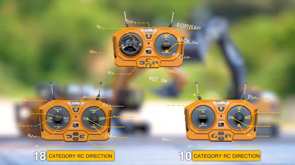 Functions: Arm Lift, Cab Rotate, Drive Forward/Backward, Bucket Scoop, Light Sound Simulation
