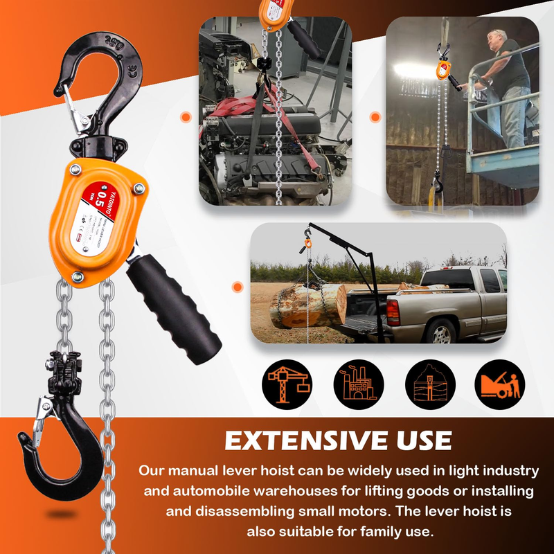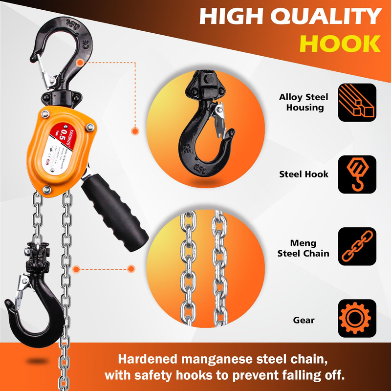 ? HIGH QUALITY G80 CHAIN ?--G80 material chain, 360-degree rotary stamping lock hook corrosion resistant, wear resistant, no slip hook. The 1/2 ton chain hoist is endowed with the characteristics of safety, efficiency and durability