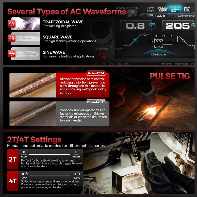?????? ?????? ???? ??????????? ?????The ac/dc TIG welder is equipped to prevent the burning of materials and minimize material distortion from excessive heat input. SQUAREWAVE with stable dynamic arc, forming a stable molten pool. SINE WAVE with lower noise decibels, enjoy the welding process. TRAPEZOIDAL WAVE with low heat output, Rapid prototyping when welding thin plates.